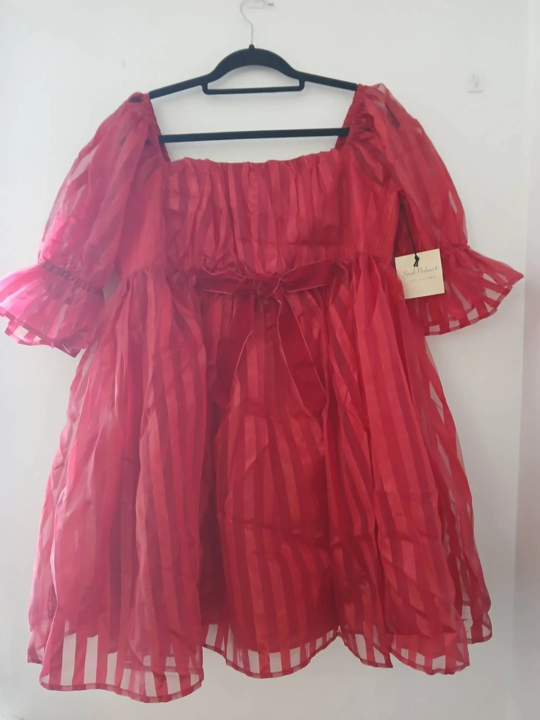 This Sweet Paris dress features a bold red hue with vertical stripes. It's made of sheer organza fabric. The sleeves are puffed with ruffled cuffs and a tie detail at the waist adds a nice touch.