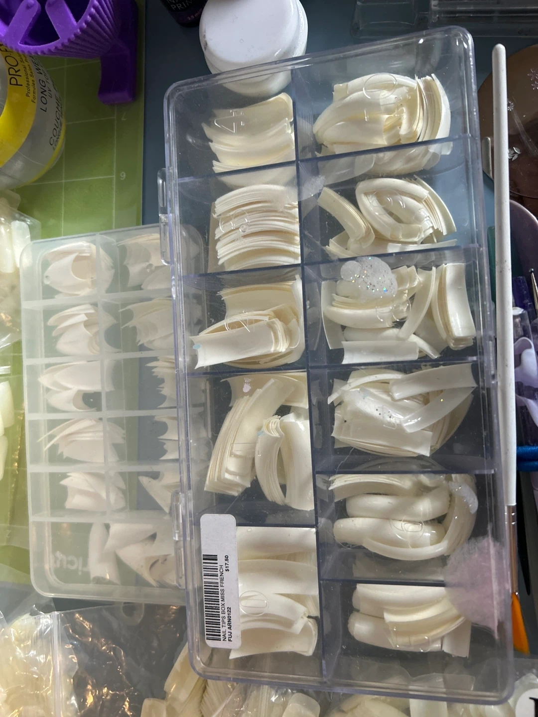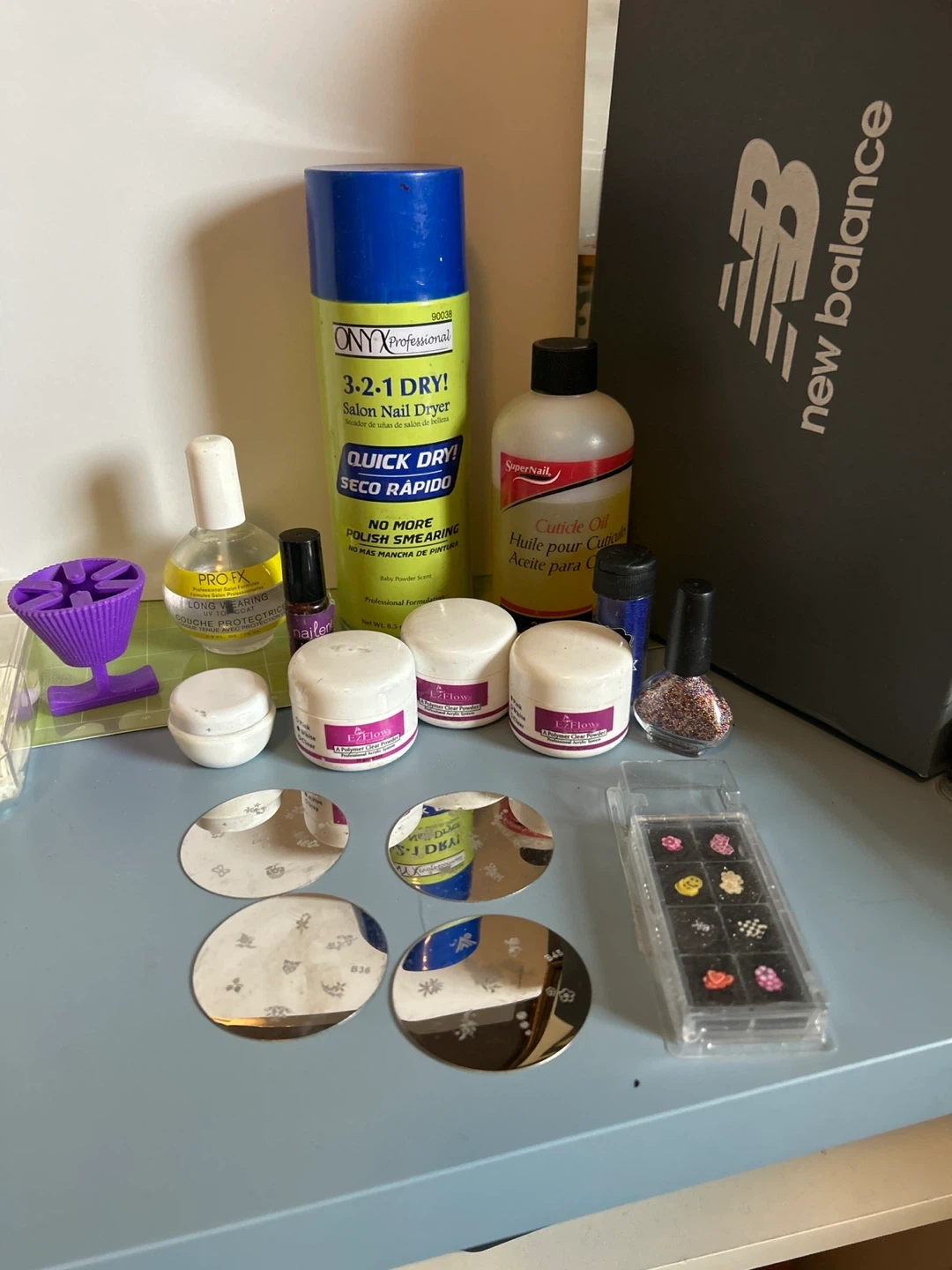 This is a comprehensive nail art and manicure kit. It includes a variety of nail tips in different sizes, stamping plates, brushes, cuticle oil, and a quick-dry nail dryer spray. There's also a Sephora nail prep set and other accessories for creating salon-quality manicures at home.