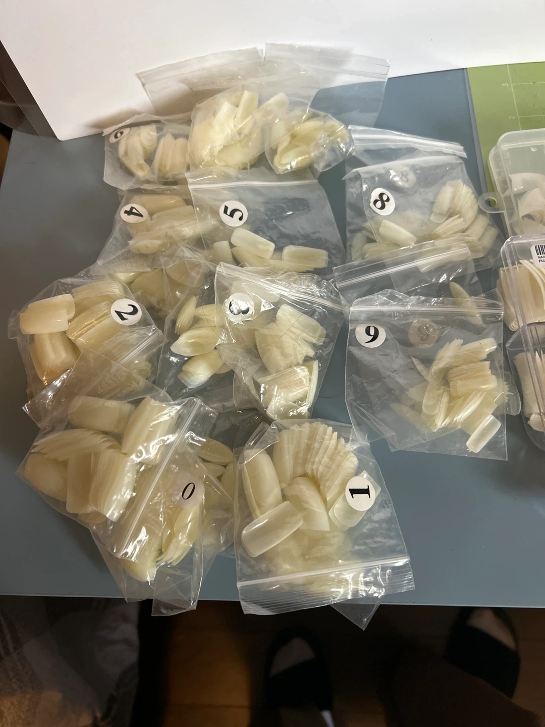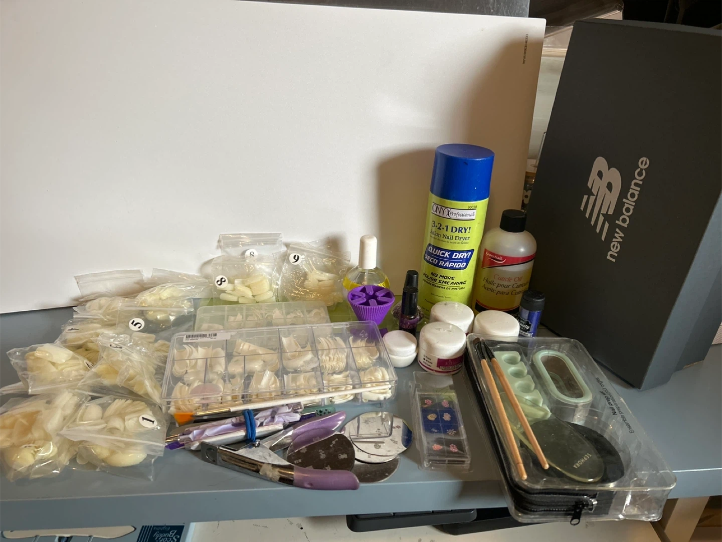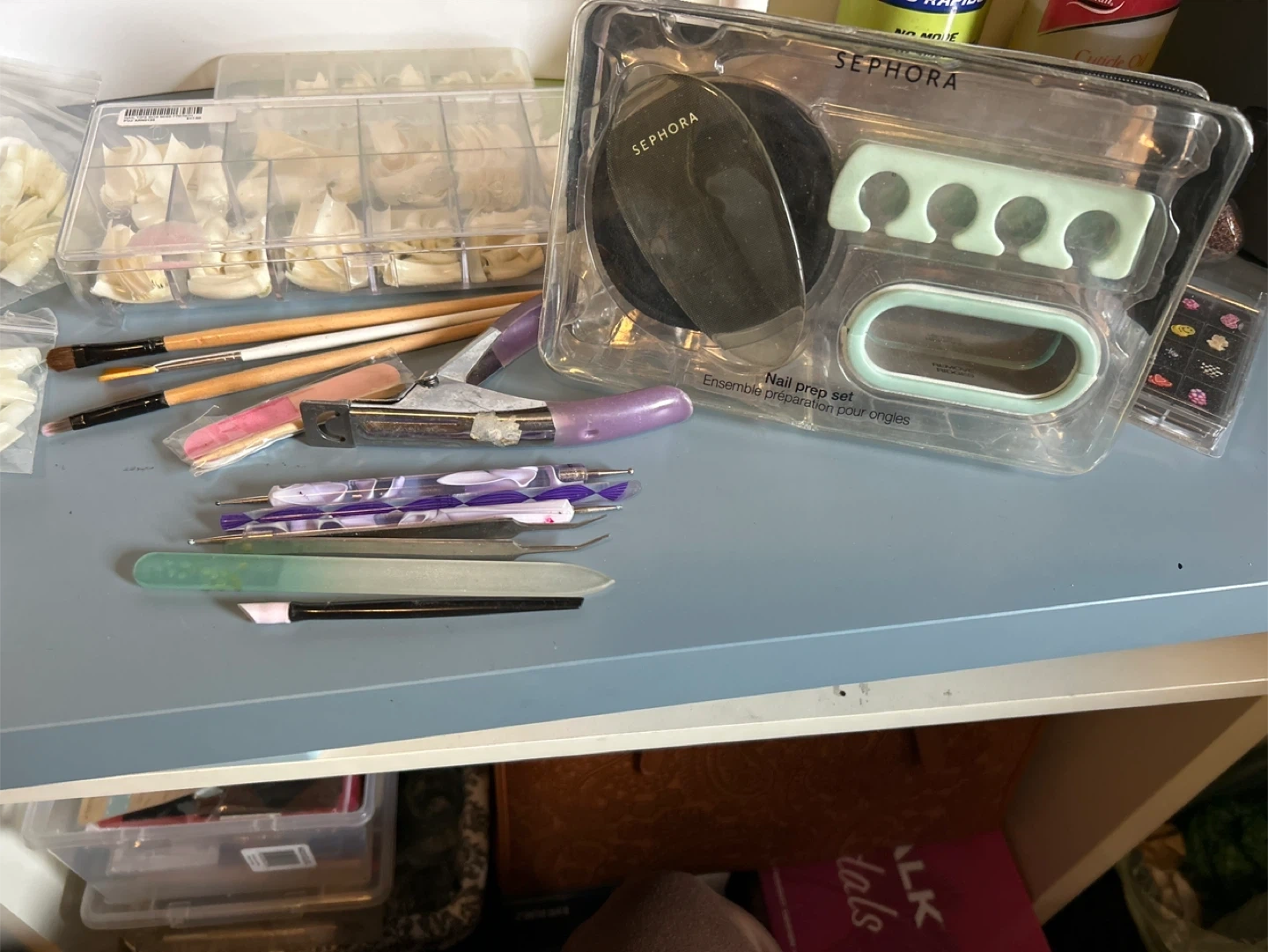 This is a comprehensive nail art and manicure kit. It includes a variety of nail tips in different sizes, stamping plates, brushes, cuticle oil, and a quick-dry nail dryer spray. There's also a Sephora nail prep set and other accessories for creating salon-quality manicures at home.