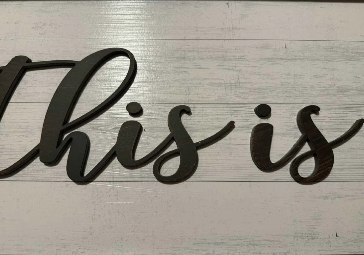 A charming wooden sign featuring the phrase 'This is Us' in a rustic, distressed white wood background with a dark wood frame. It's a lovely piece for home decor.