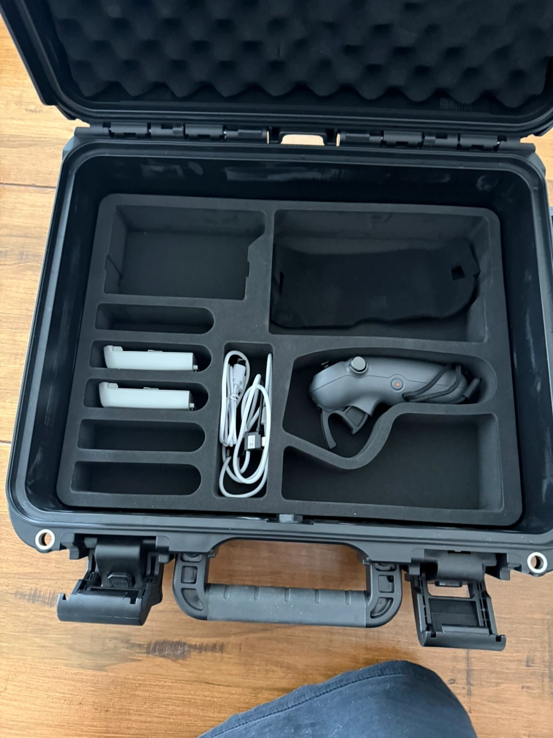 This kit includes the DJI NEO drone, goggles, and an extra controller. It also comes with batteries and charging cables, all stored in a protective hardshell case. This setup is great for immersive FPV flying experiences!