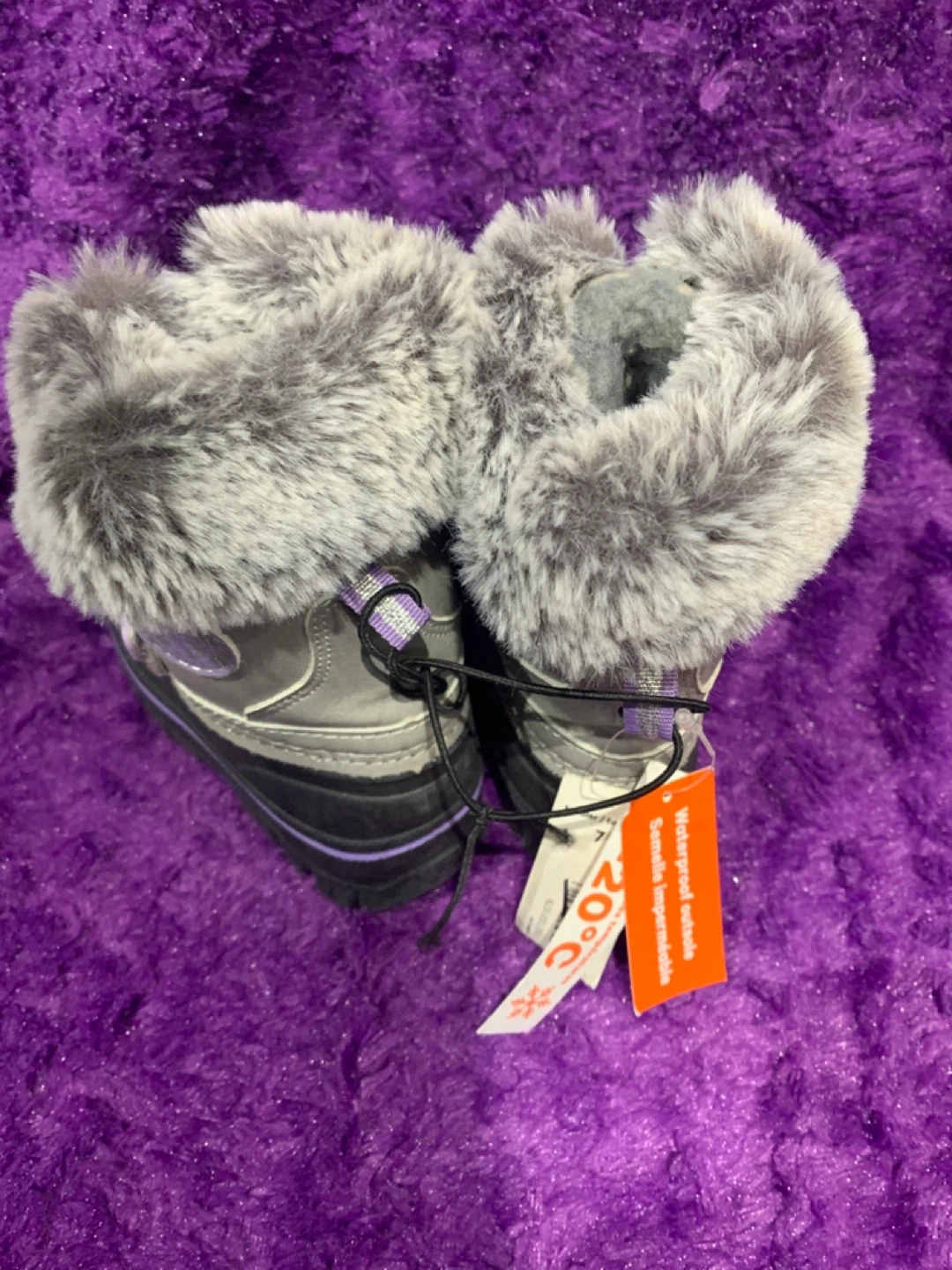 These grey and black snow boots are designed for kids. They're waterproof and insulated, with a cozy faux fur lining. These boots would be useful for keeping little feet warm and dry during winter activities.