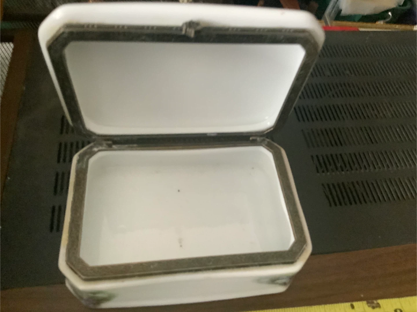This is a Serendipity USA porcelain hinged box. It's white with a decorative metal trim. Perfect for holding small treasures!