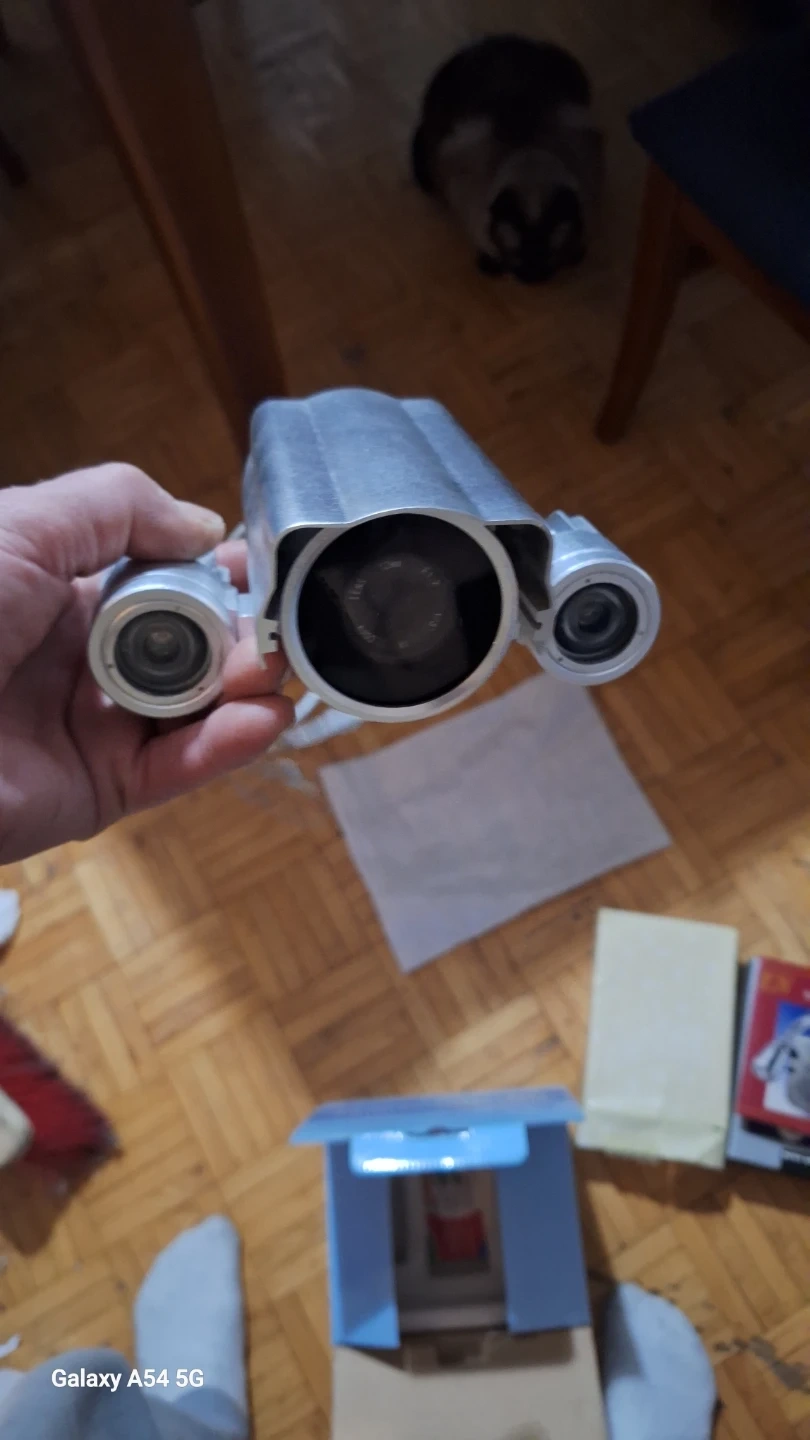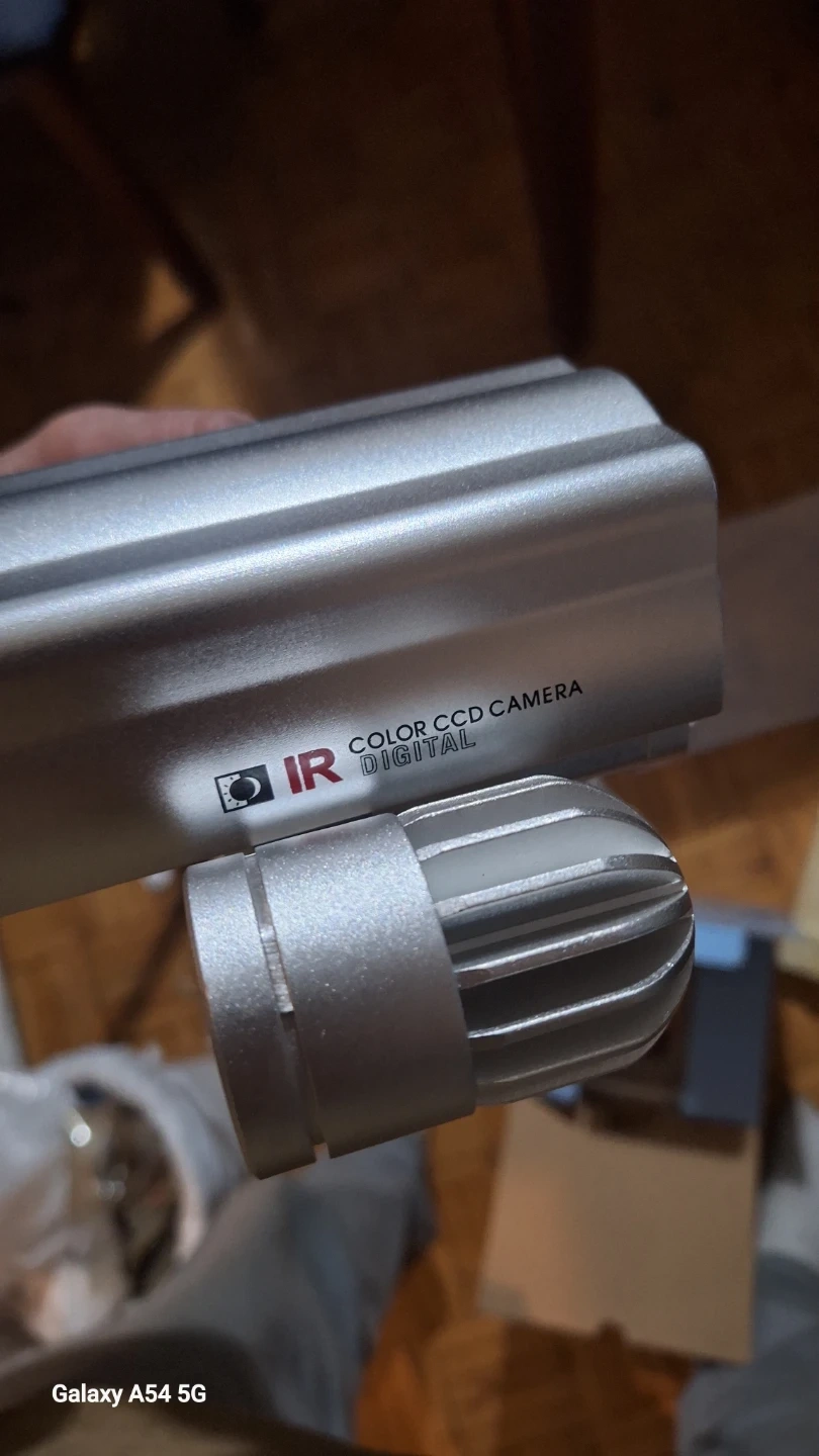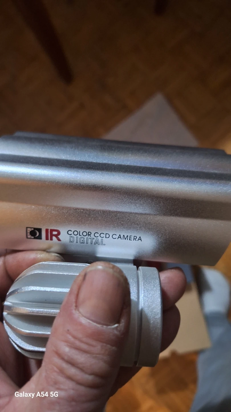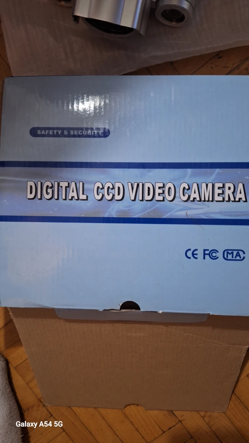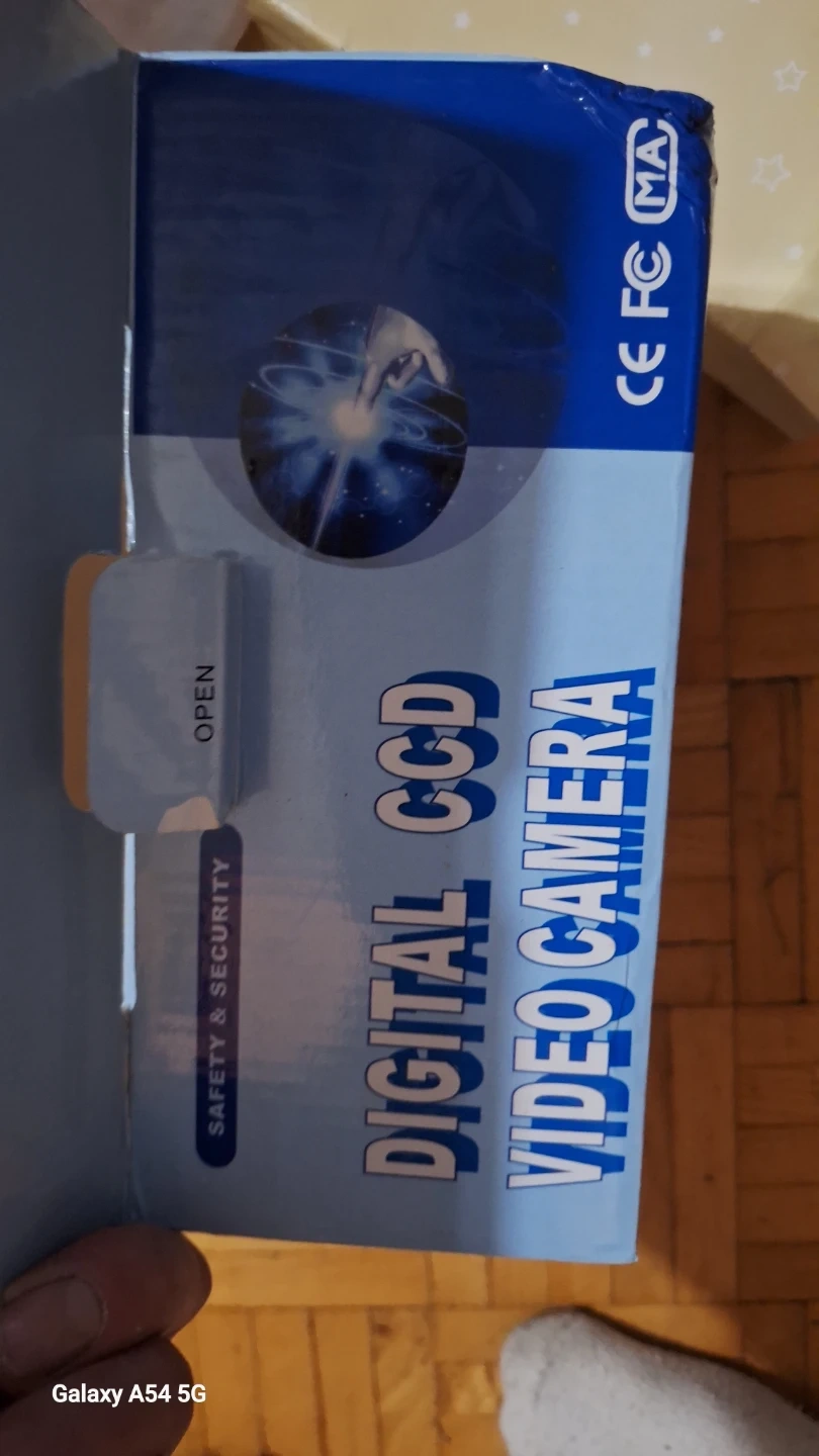 This is a digital CCD video camera. It's made of silver-coloured metal. Includes original box and packaging.