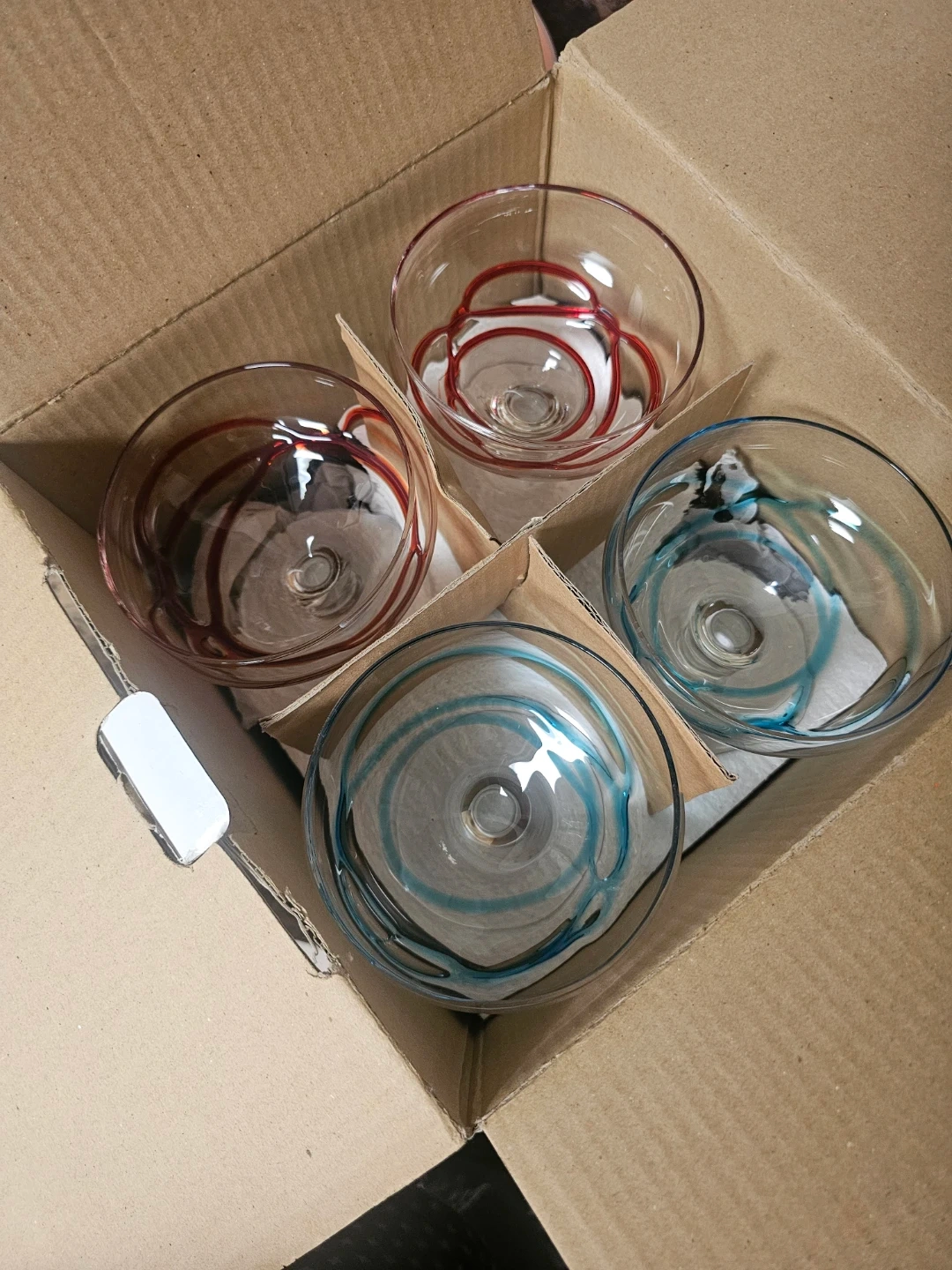 Beautiful, high-quality Bormioli Rocco glass dessert bowls. Perfect for fruit, ice cream, or snacks. Each piece is handmade and unique with colorful swirls.