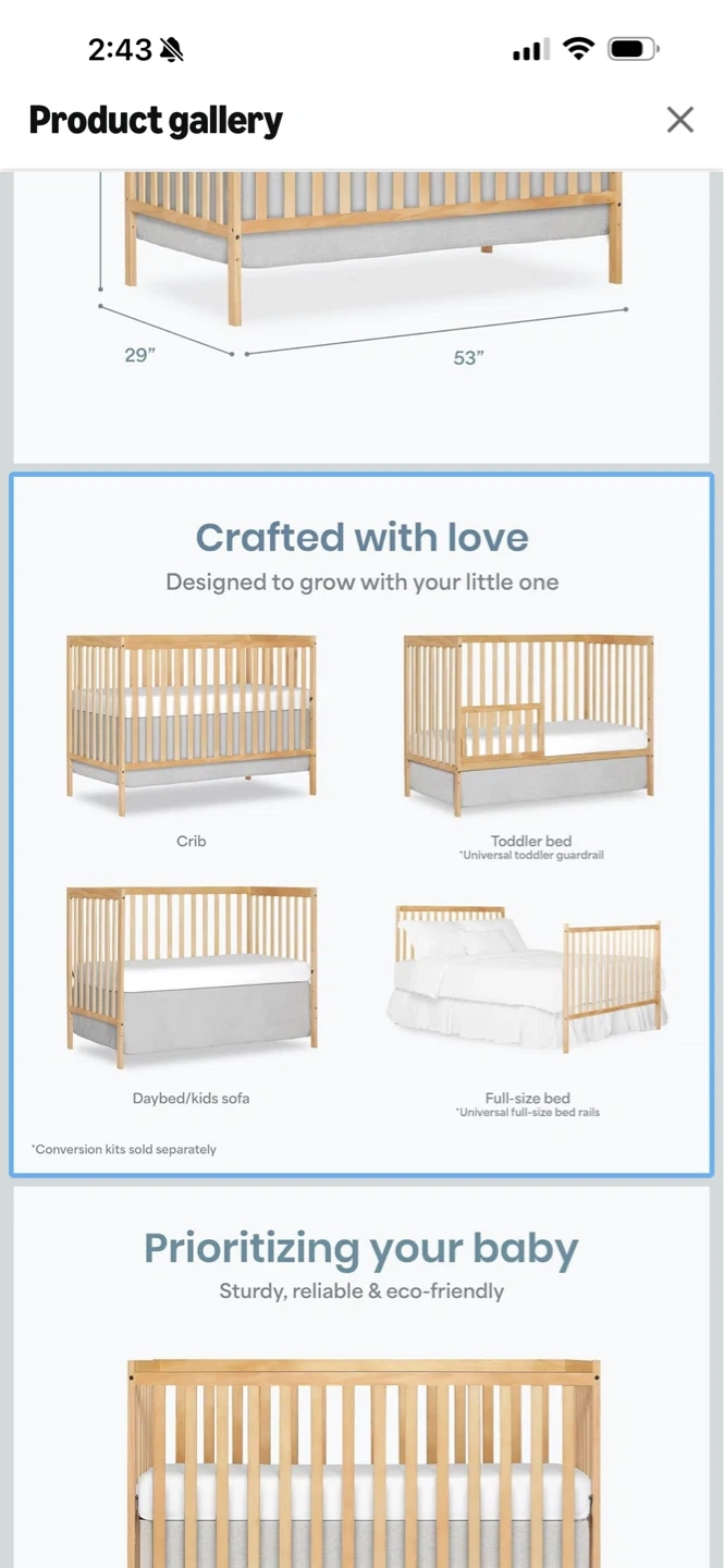 Solid wood crib with a fitted sheet and mattress. Converts to a daybed or toddler bed. Sturdy and eco-friendly design.