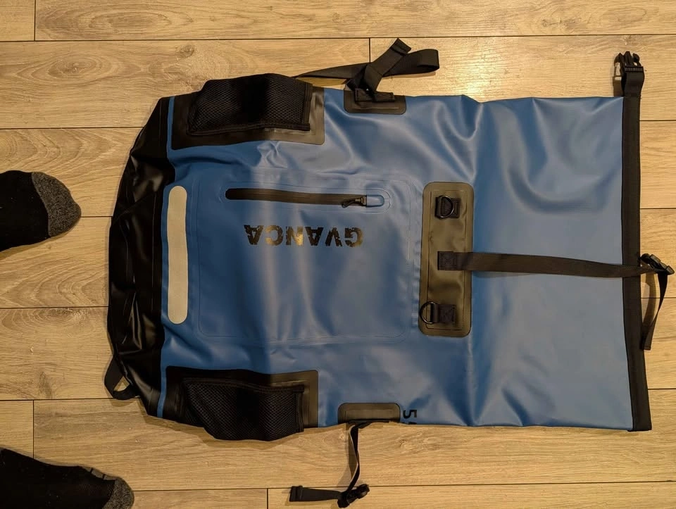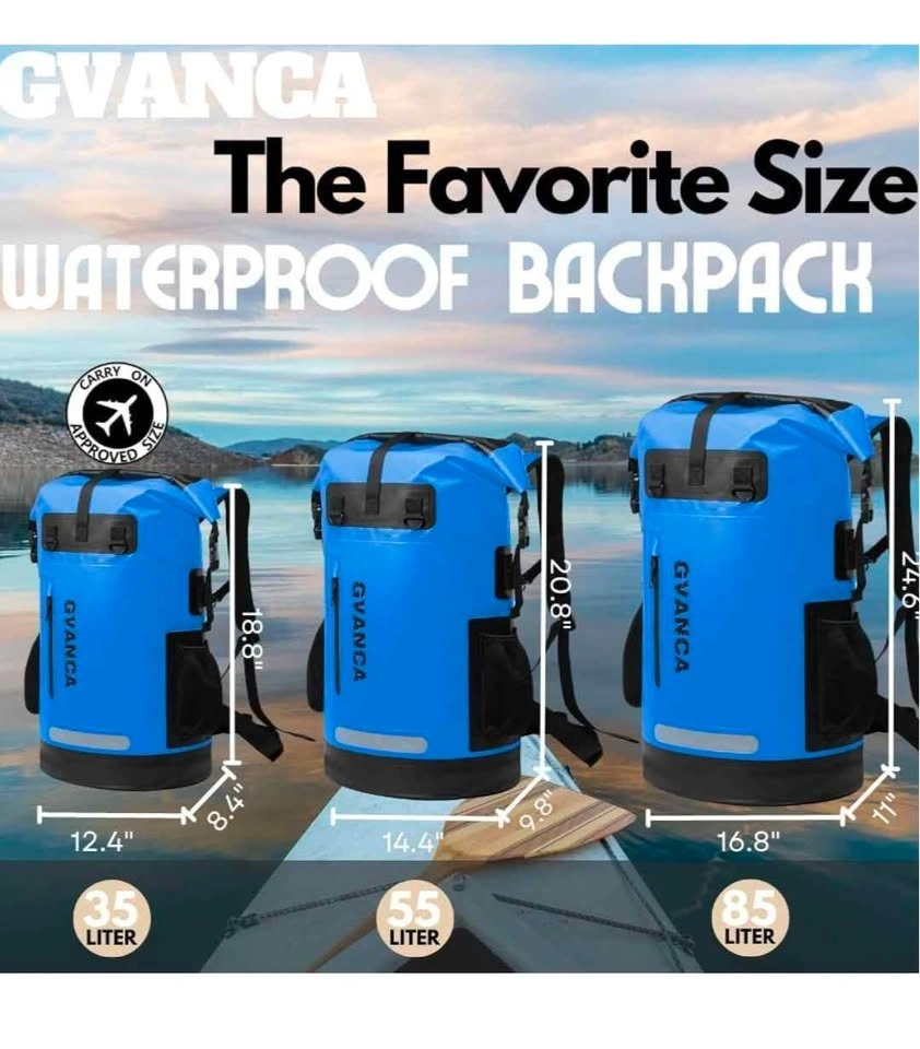 GVANCA blue waterproof dry bag backpack. This is a big 55L size. Has a roll top closure and is made with 500D waterproof material so your stuff stays super dry. Has a splash-proof pocket outside and reflective tape too. Back has a breathable cushion, adjustable chest straps, and a detachable waist belt for comfort. Perfect for kayaking, boating, fishing, camping, or any water activities.
