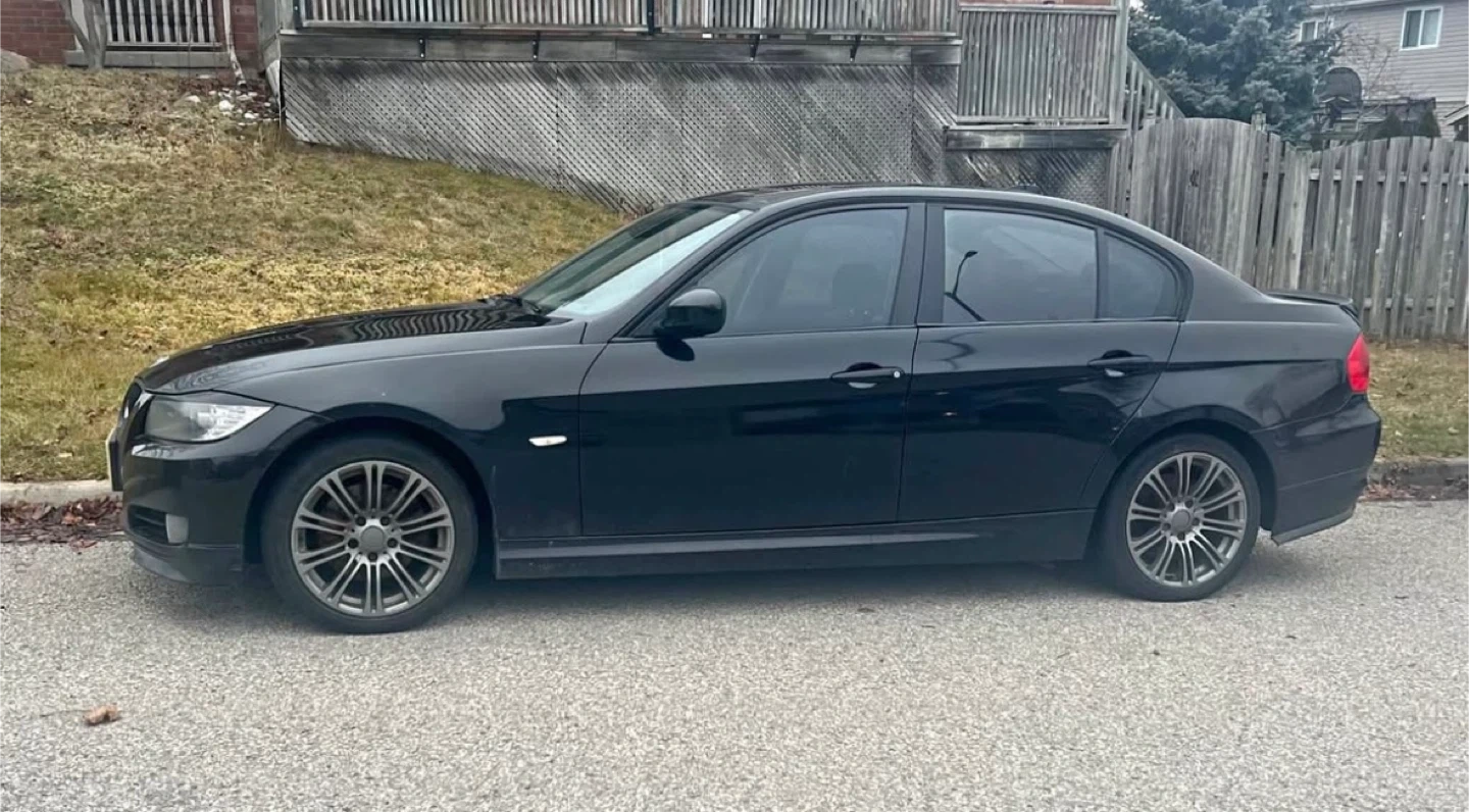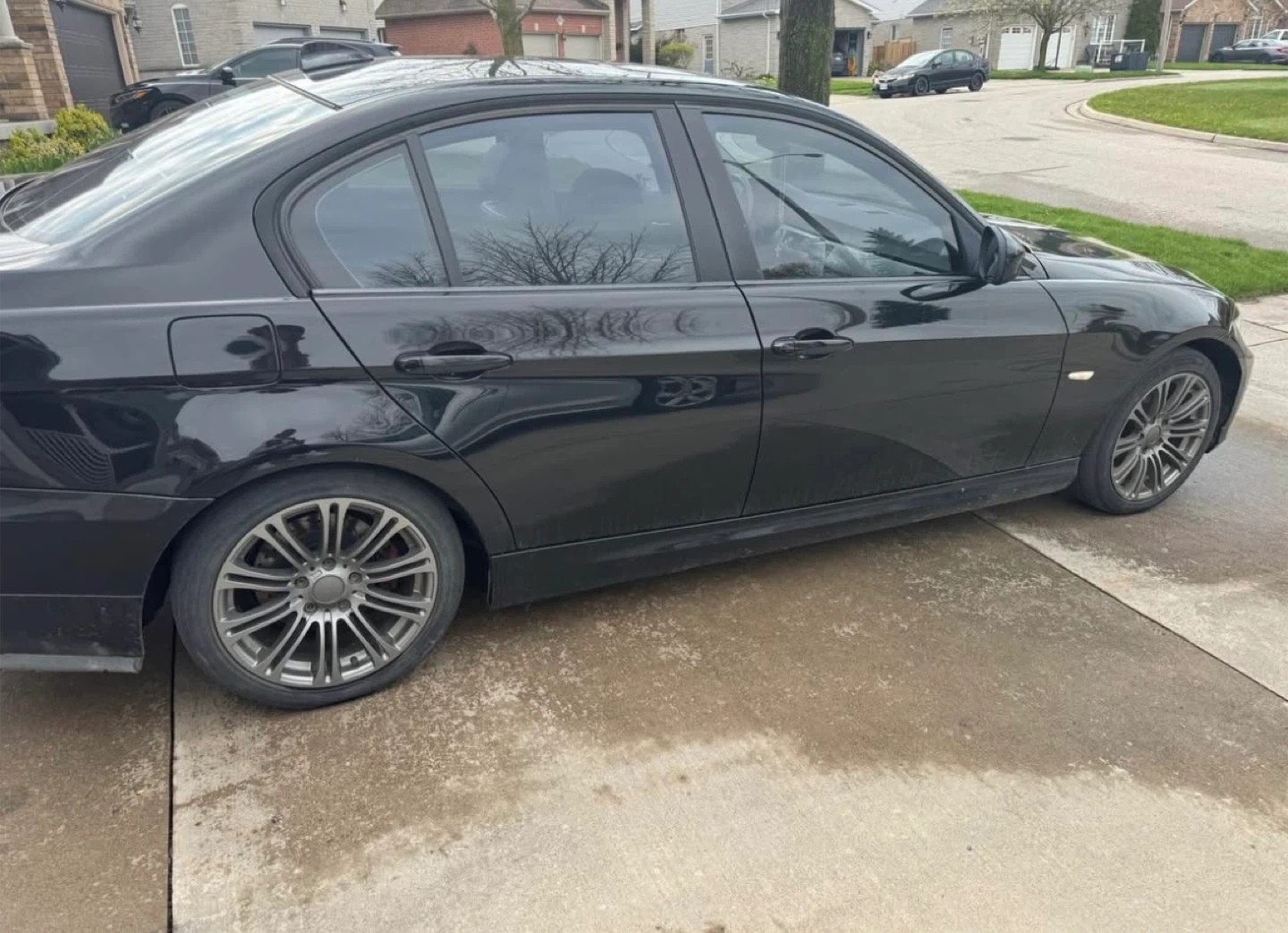 This is a black BMW 3 Series sedan. It's a four-door vehicle with alloy wheels. The interior features black leather seats and a modern dashboard.