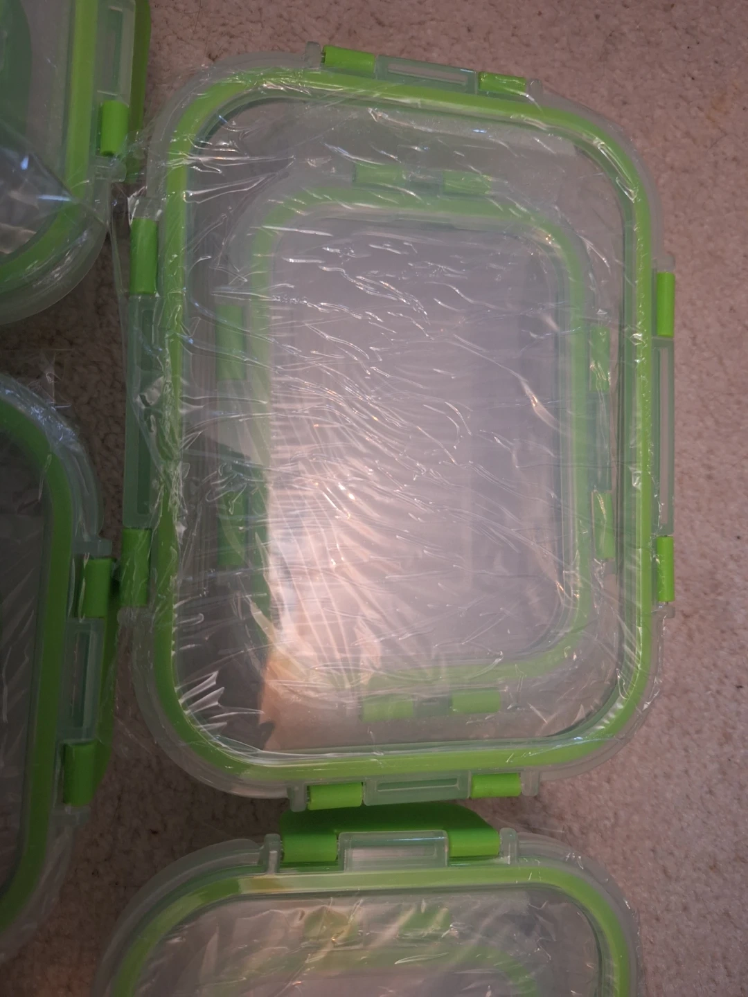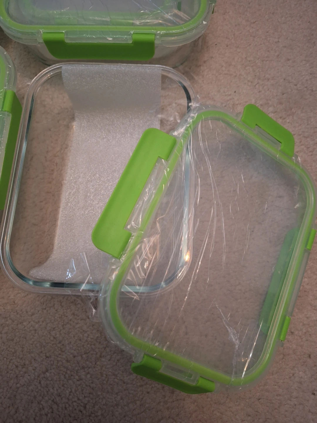 Set of glass food storage containers with green locking lids. These containers are made from durable borosilicate glass. They're dishwasher, freezer, and oven safe (not the lids). They offer a leak-proof seal for convenient food transport.