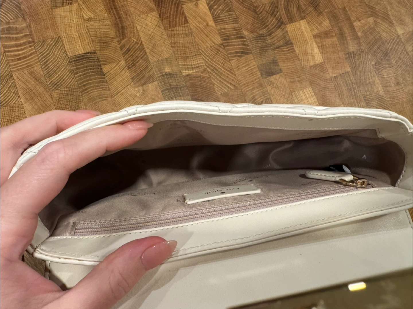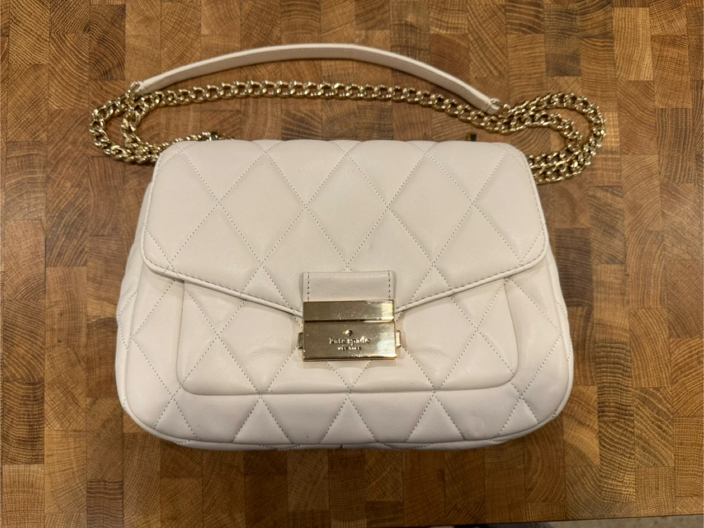 A Kate Spade Carey Small Shoulder Bag in an offwhite colour. Original retail price of $529. A few tiny scratches on the gold clasp but in excellent condition otherwise. Pick up only from Roncesvalles/Queen area. Cash only.