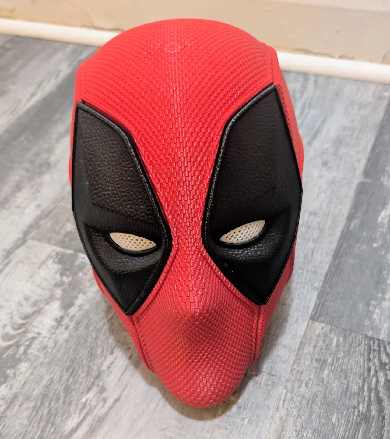 This is a 3D printed helmet of a Marvel antihero Deadpool. It's made of a textured red material with black accents for the eyes. It's magnetic.