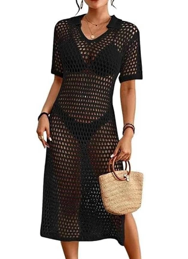 NEW Black Crochet Knit Swim Cover Up Dress Midi