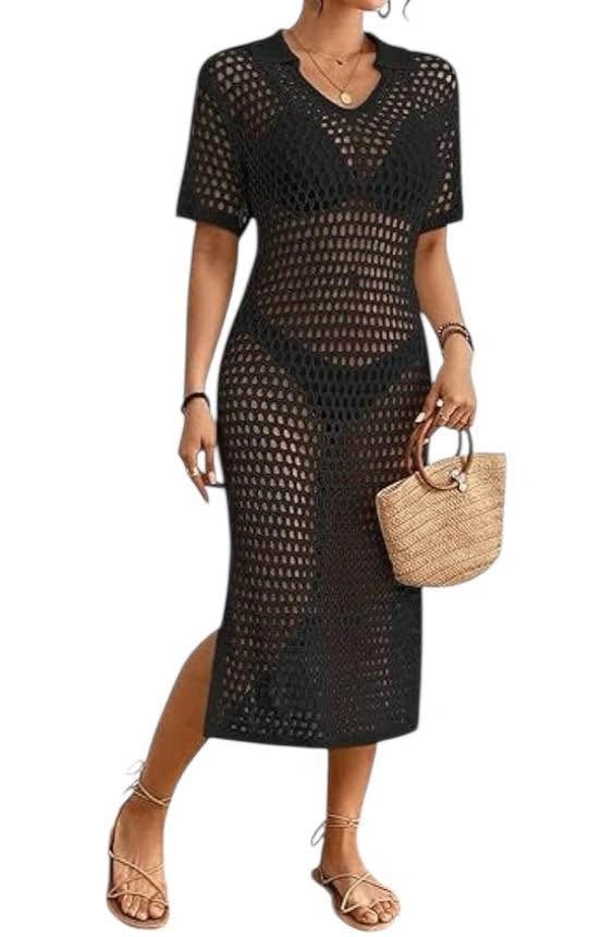 Black crochet knit cover-up with an open-weave design, classic polo collar, midi length and side slit.