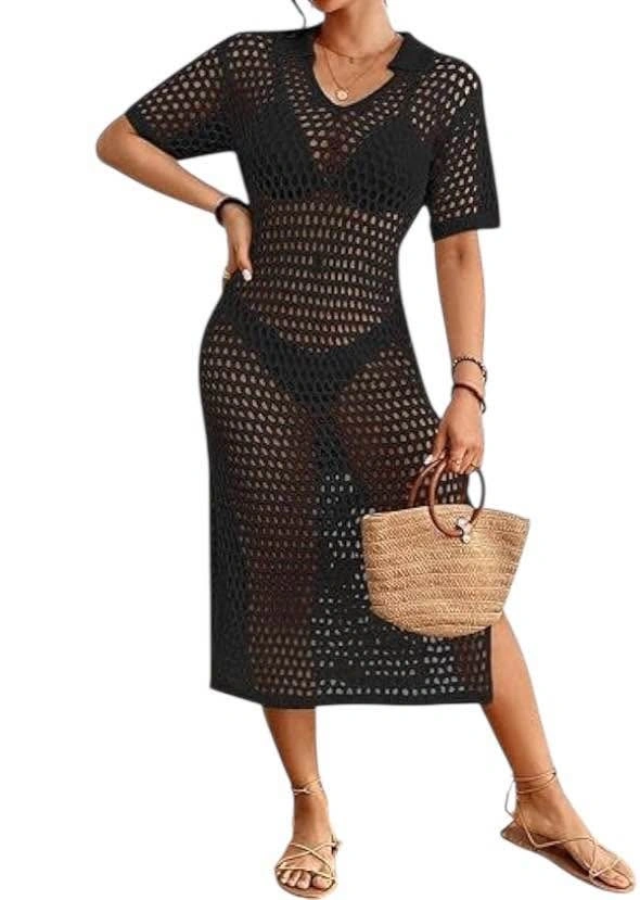 Black crochet knit cover-up with an open-weave design, classic polo collar, midi length and side slit.