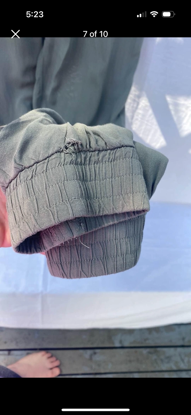 Excellent condition still, except there is some threading coming loose by the right leg cuff bottom