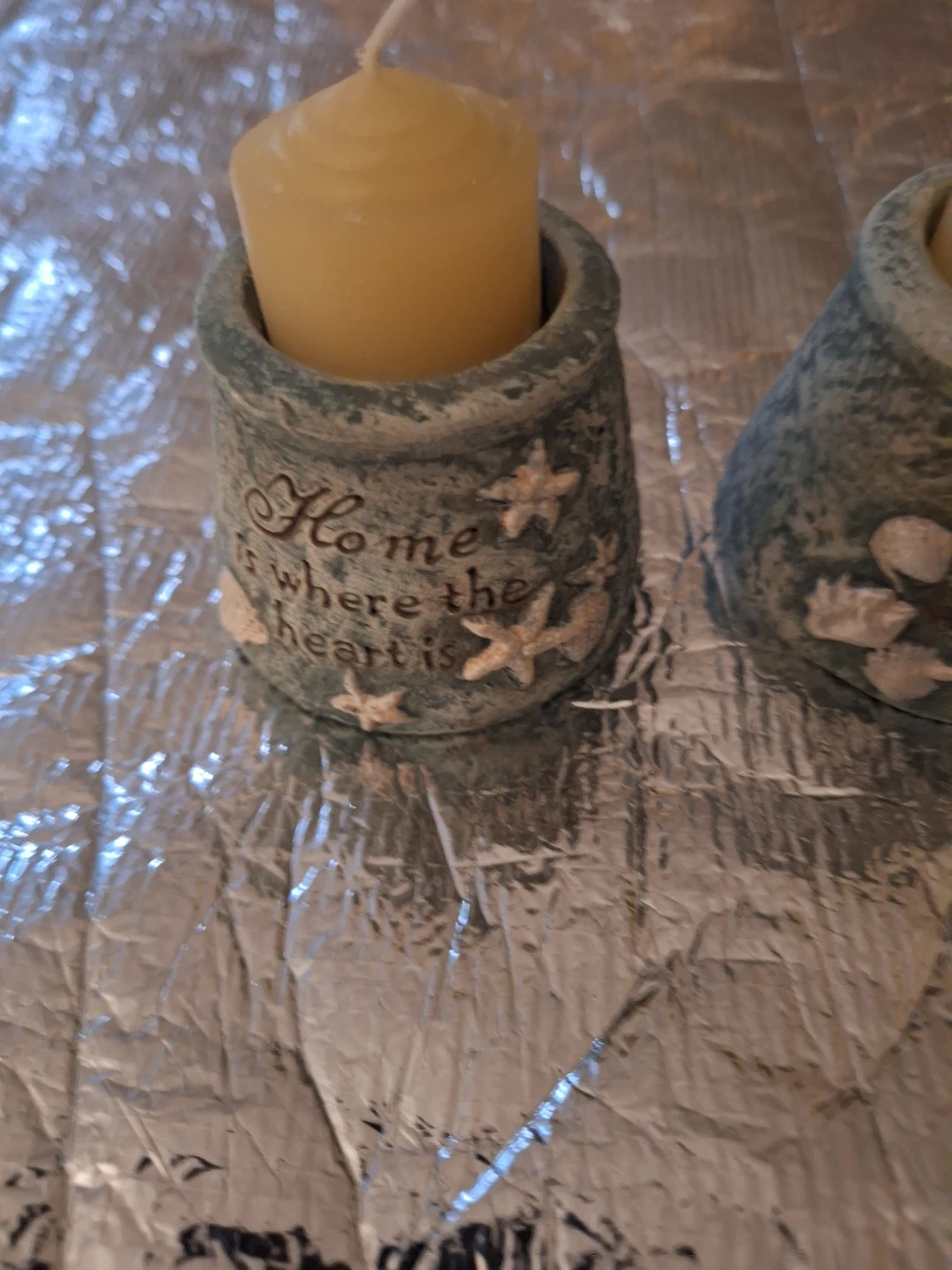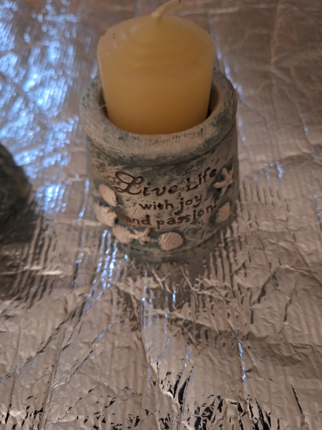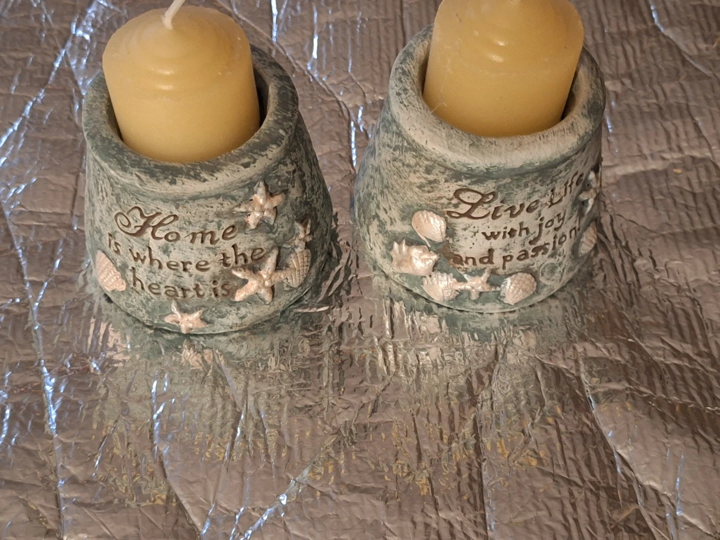 This set includes two decorative candle holders, each with a unique inspirational quote. One reads 'Home is where the heart is' and the other says 'Live life with joy and passion'. They have a rustic, beach-inspired design with starfish and seashell accents. These holders are perfect for adding a cozy and uplifting touch to any room!