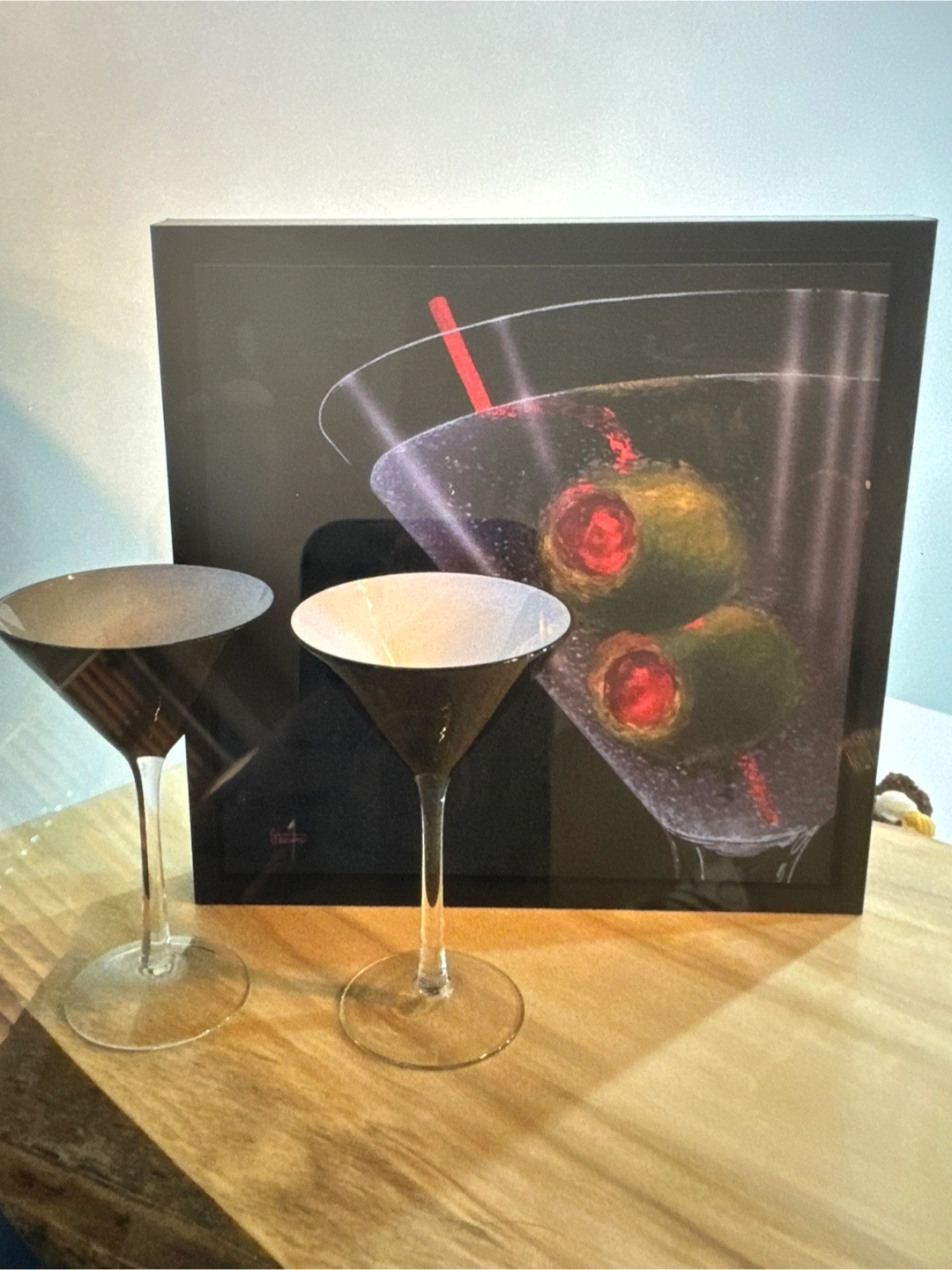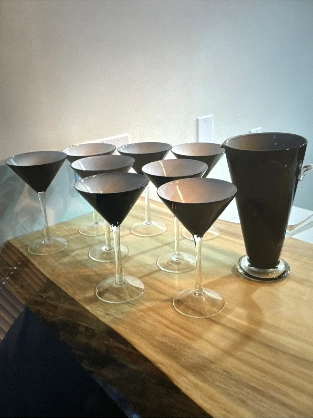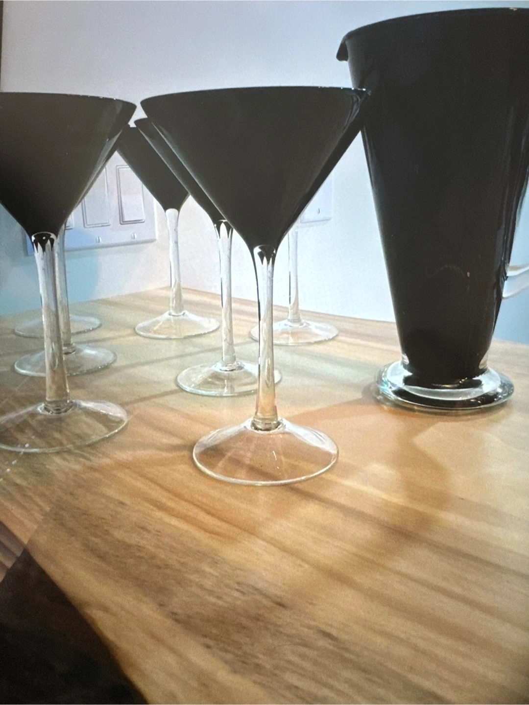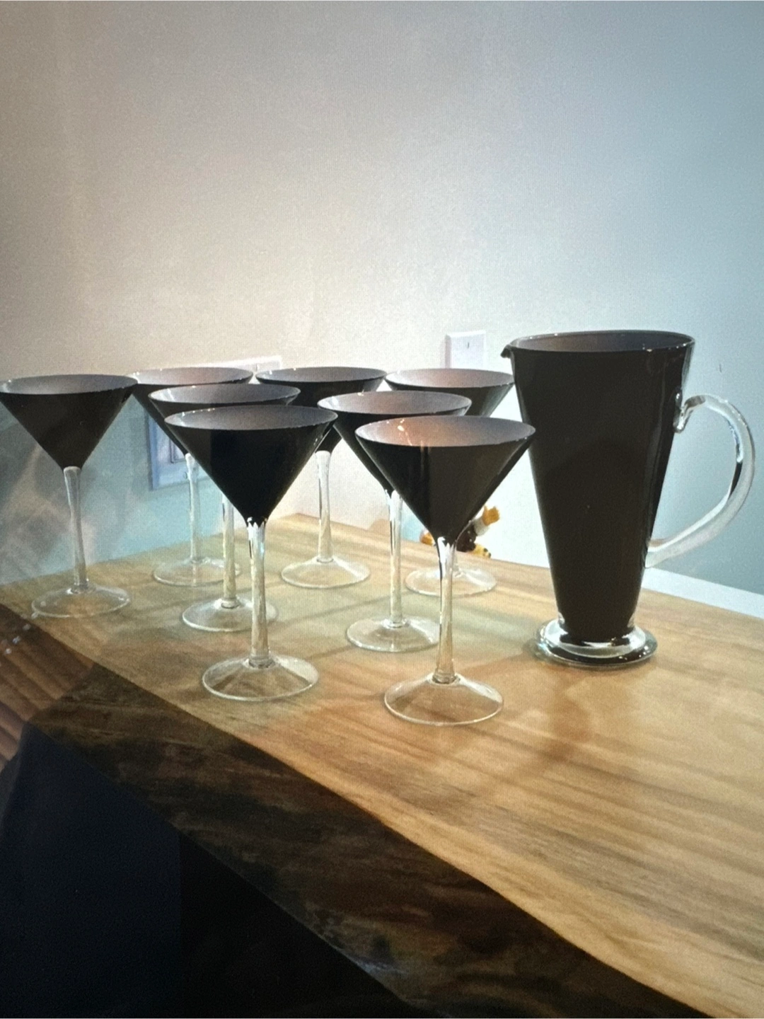 Bargain…new classy set of 8 black martini glasses, includes a matching pitcher! These are in great shape and ready for your next cocktail night. $35