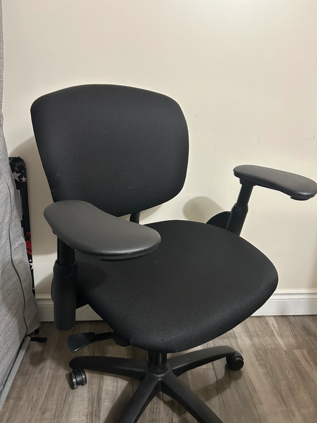 Office chair with black fabric and adjustable armrests, seat position and height.Wheels are in good condition. Selling due to moving to another place.