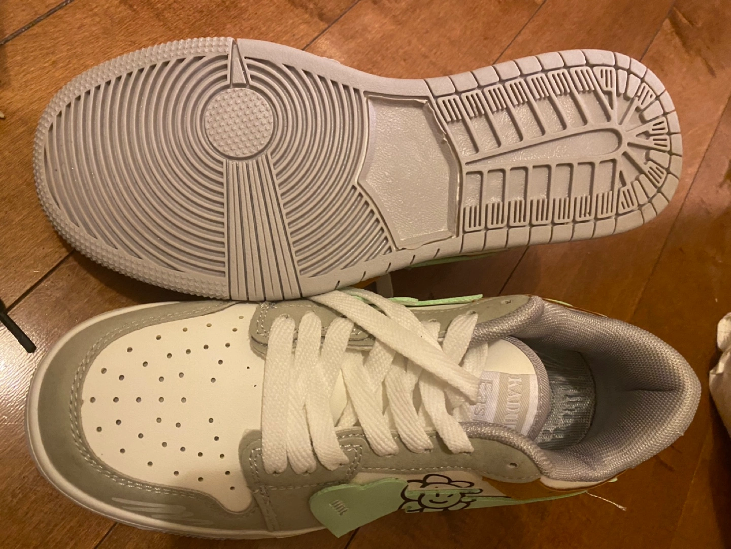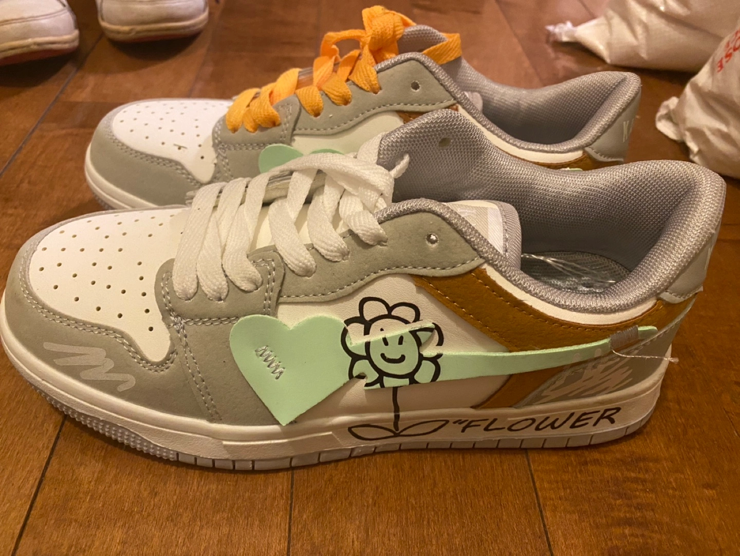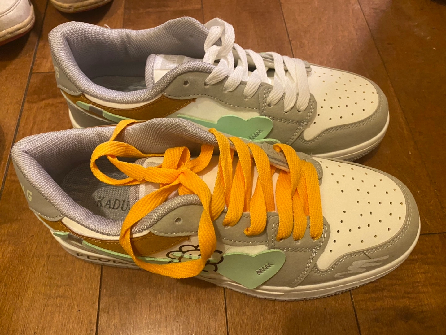 Girl, Grey and white sneakers with flower and heart design, yellow laces. Size 7. New