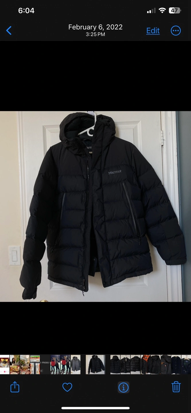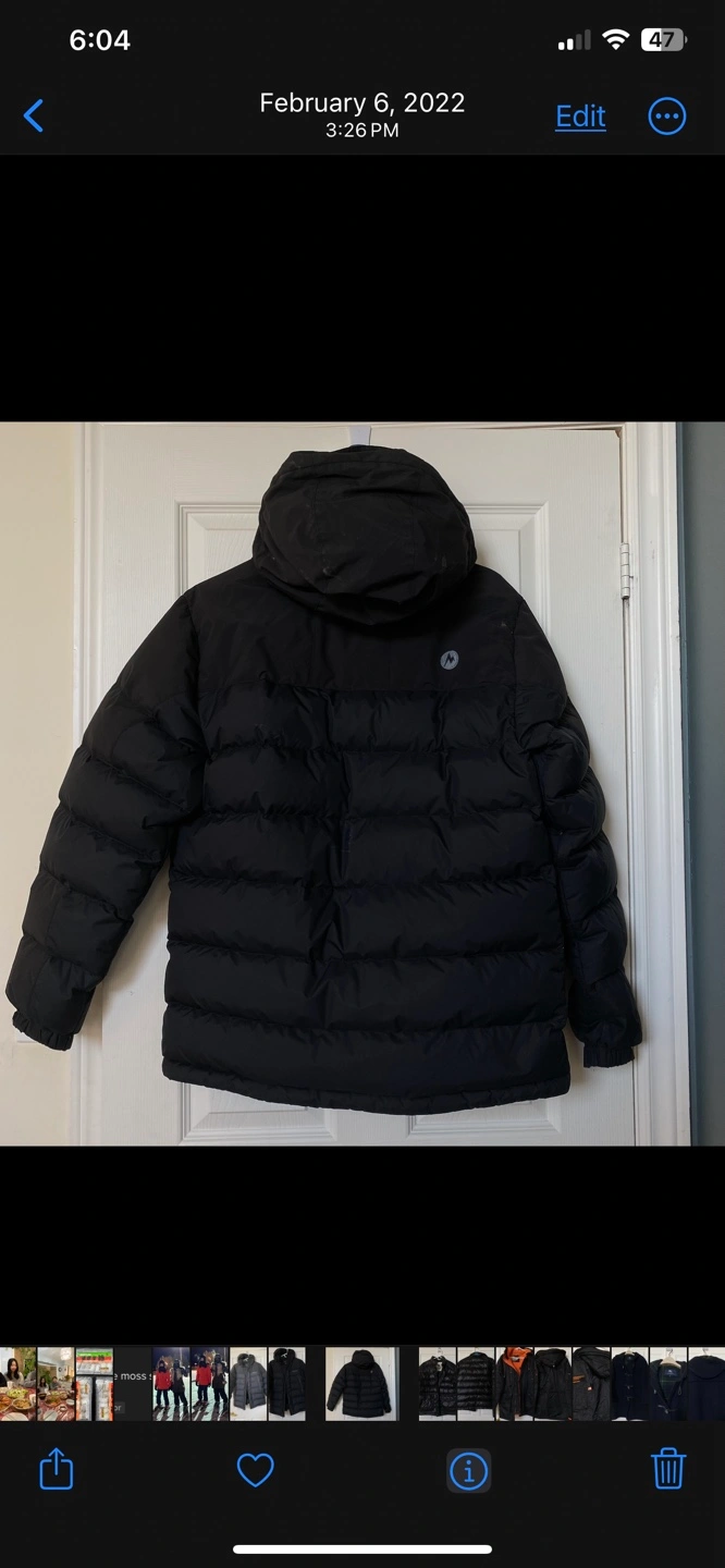53Black down jacket. Features a hood and zipper closure. Two zippered pockets on the front.