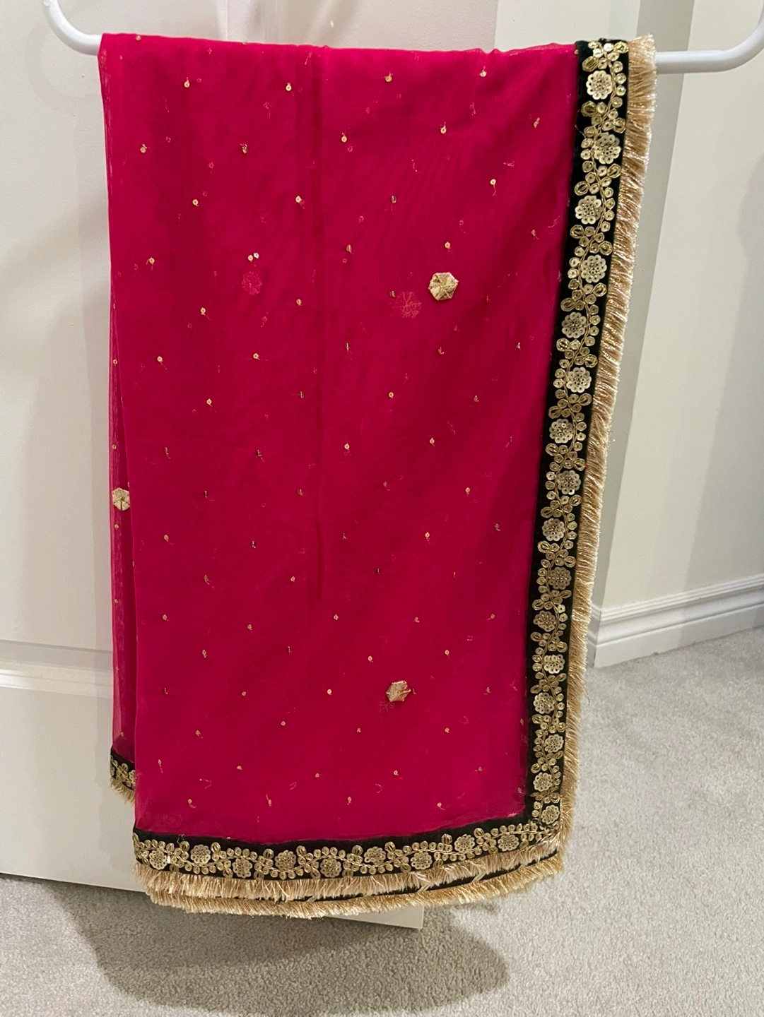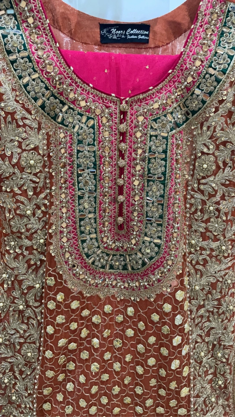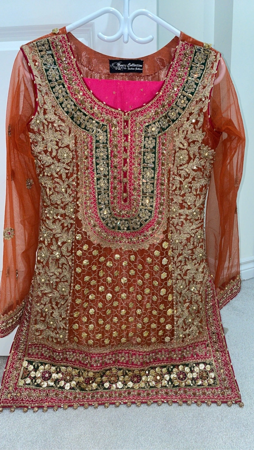 Beautiful orange and pink Pakistani shalwar kameez. The kameez is embellished with gold embroidery and sequins. Includes a matching dupatta and pants.