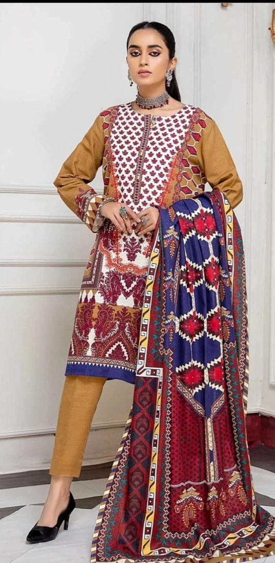 Three-piece suit featuring a long-sleeved mustard shirt, trousers, and a printed dupatta with blue and red accents. The shirt has a decorative neck and intricate prints. The dupatta is a vibrant blue with intricate design details.