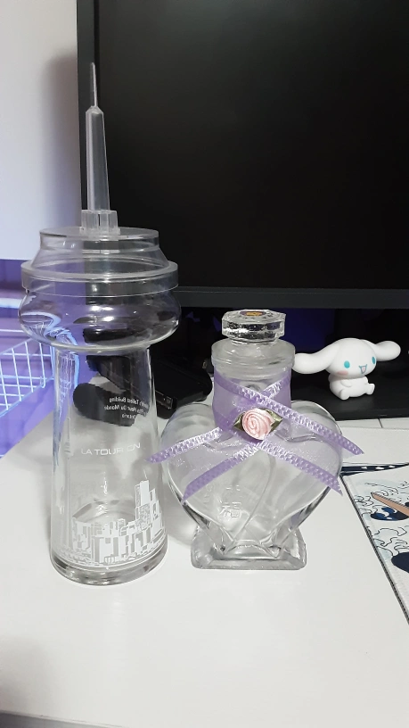 Heart-shaped glass bottle with a purple ribbon and a small flower detail and CN Tower glass