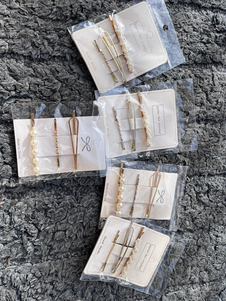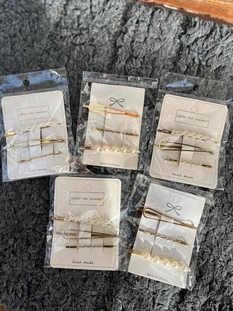 Set of 3 gold hair clips with pearls. One clip is a simple straight bar, another is a curved bar, and the third is a twisted bar.