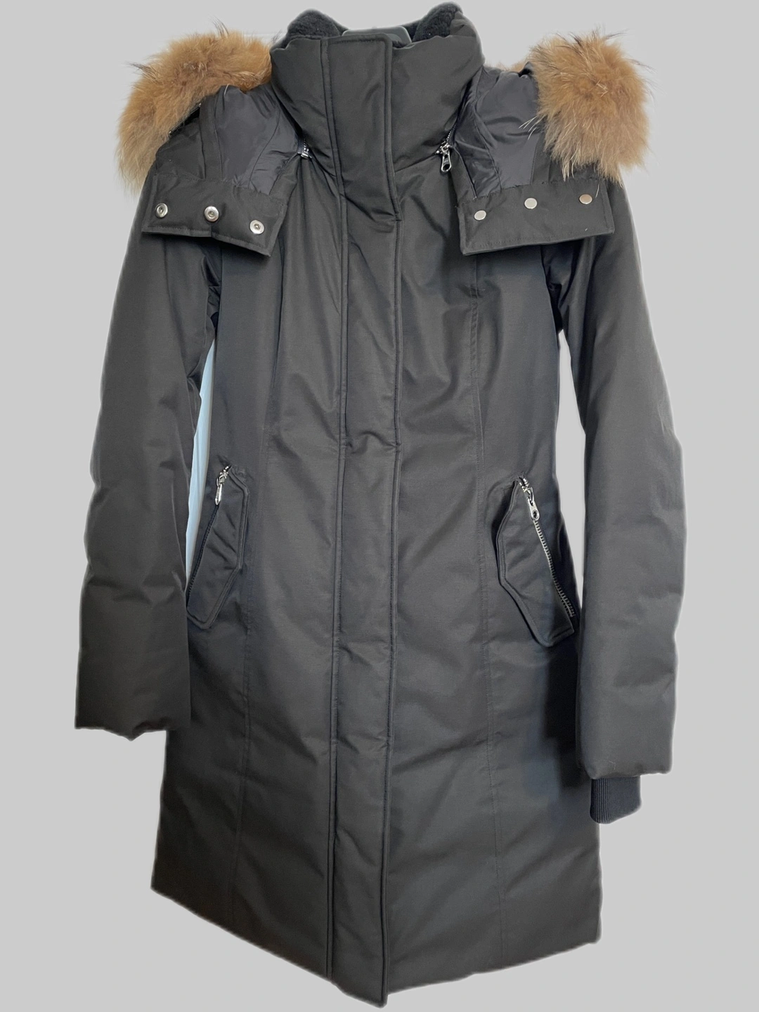 The Kerry by Mackage is a luxurious down winter coat, in an above-the-knee length and a sleek, silhouetted fit. It’s padded with Pekin Duck down insulation and has a weather resistant outer shell made from a durable blend of cotton and nylon. Its hood is outlined with an Asiatic Raccoon fur trim that is removable, and the inner collar is furnished with plush black curlt sheepskin. The Kerry’s hood is entirely detachable, allowing for a versatile wearing style. Leather trim along the zipper and leather pocket welts provide contrasting accents. The nickel hardware gives this down coat a touch of elegance. Comes with original Mackage garment bag.