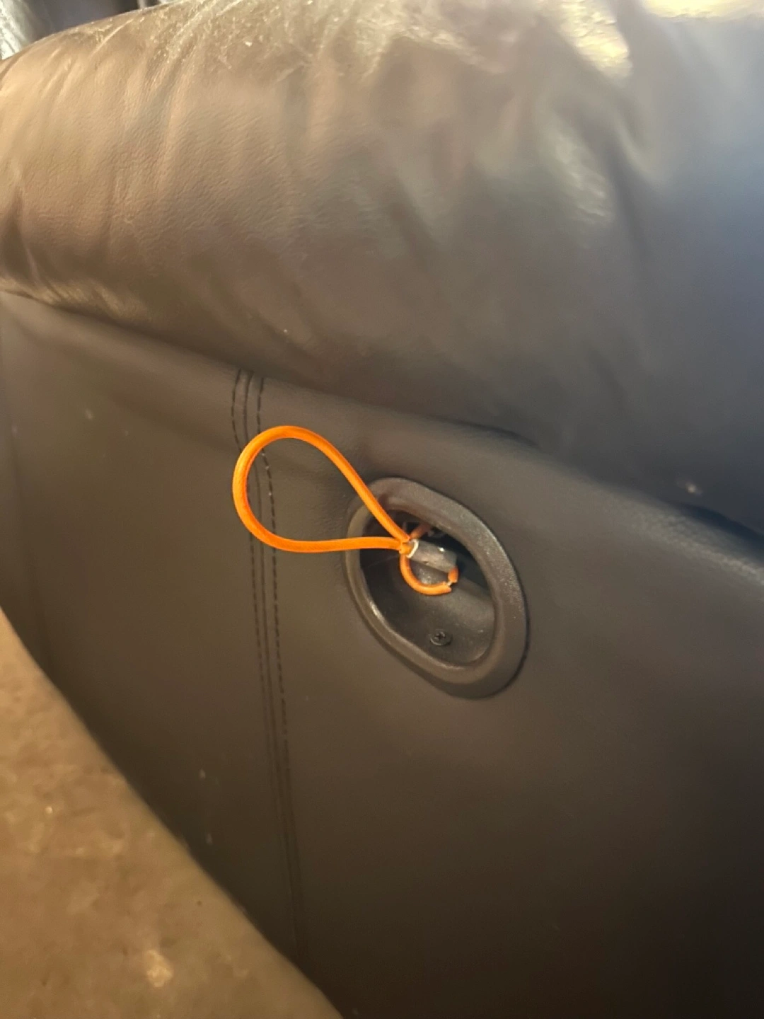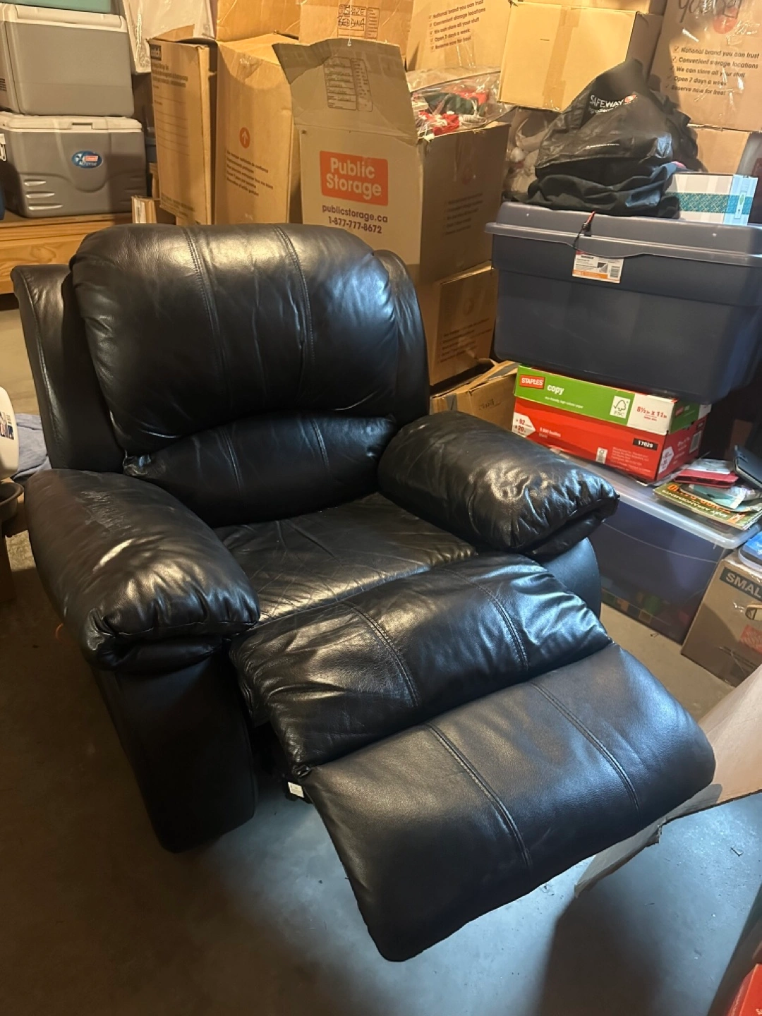 Black faux leather recliner in good condition. Reclines, handle is broken but pull wire works to still recline. Pick up only.