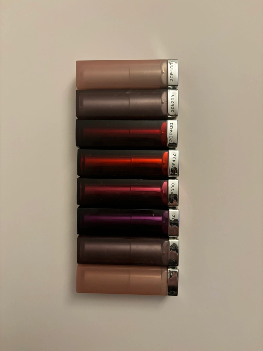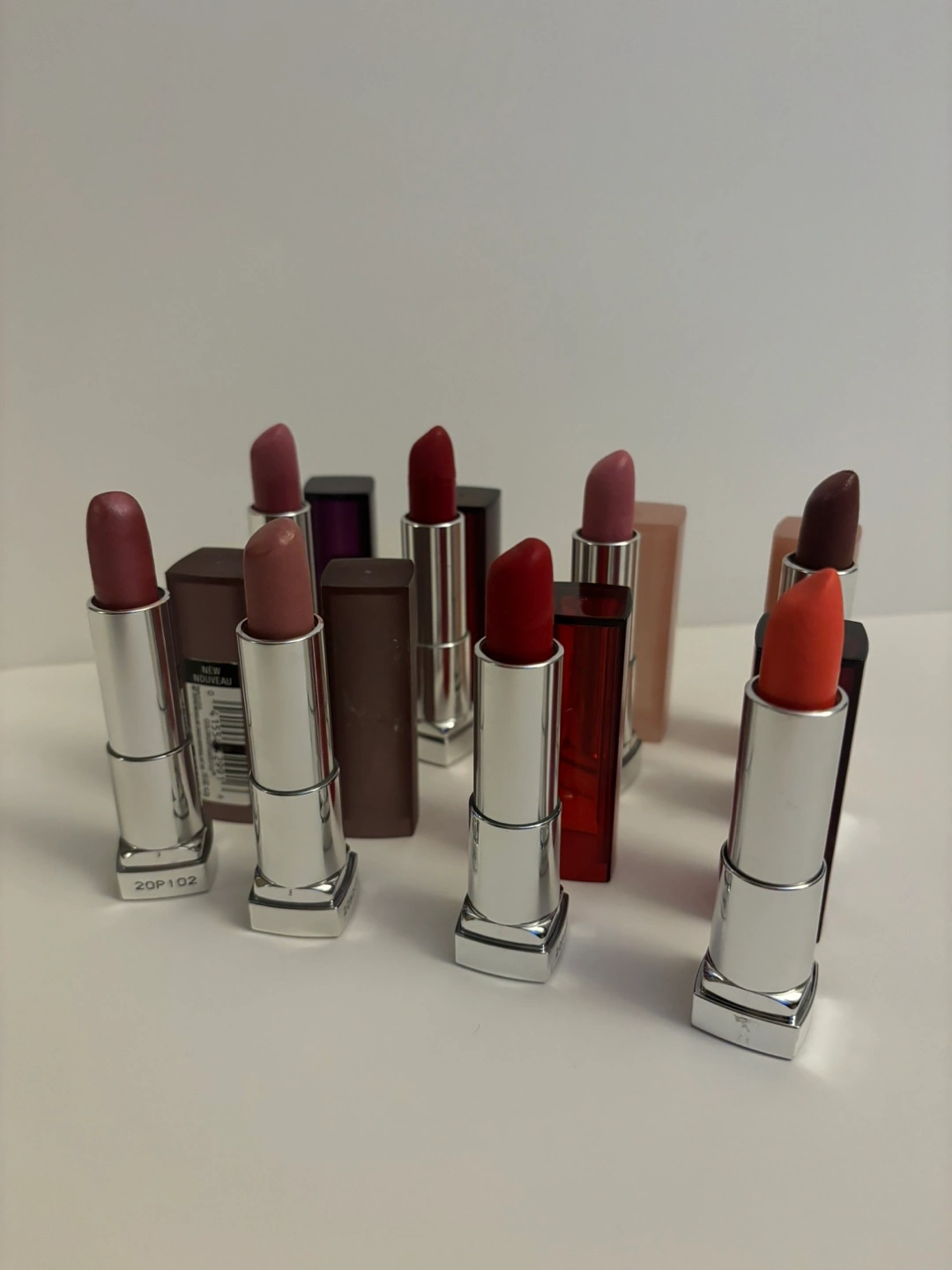 Set of 8 Maybelline Color Sensational lipsticks in a range of beautiful shades. They’ve been used, but there’s still plenty of product left. Perfect for trying out new colors without the full price!