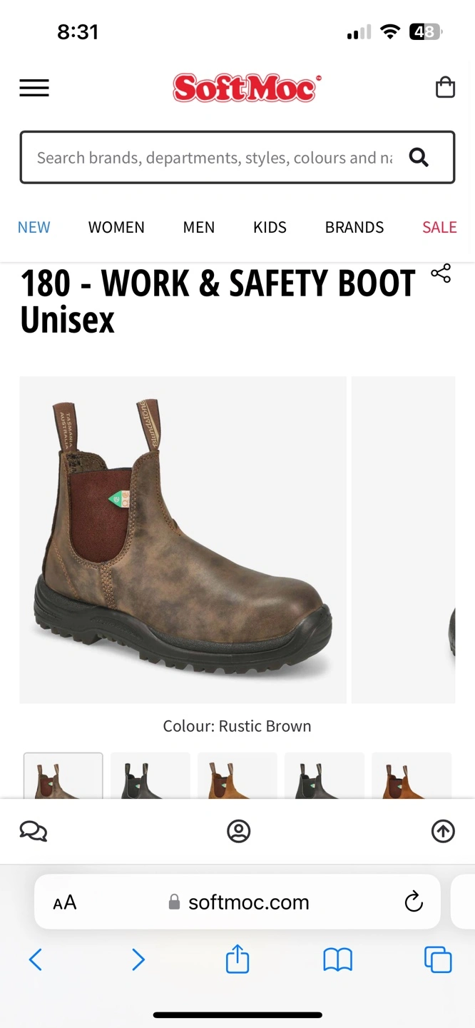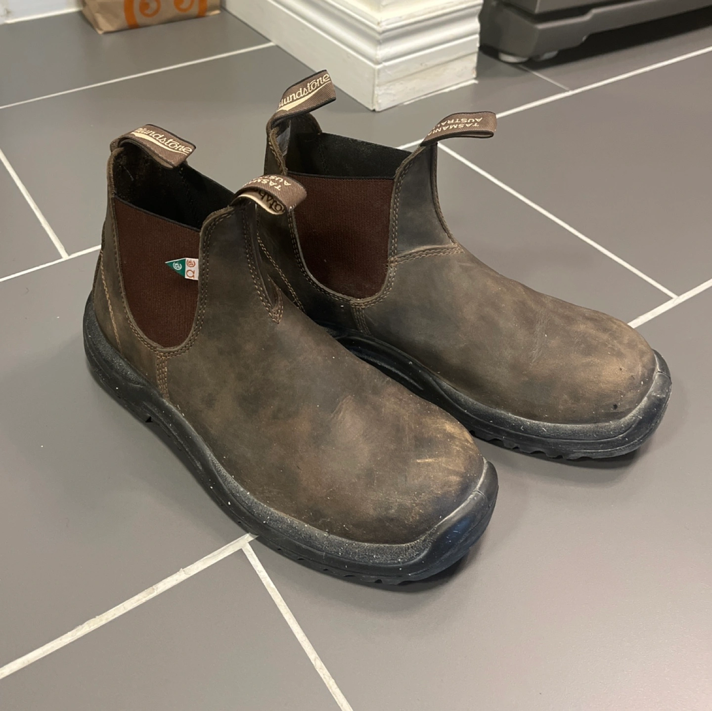763Rustic brown leather safety and work boots. Has a protective steel toe inside the shoe. Worn only for a short work contract, in excellent condition. Comfortable! Only worn 6 times, bc I visited 6 job sites as part of my work contract. Sells for $240 plus tax.