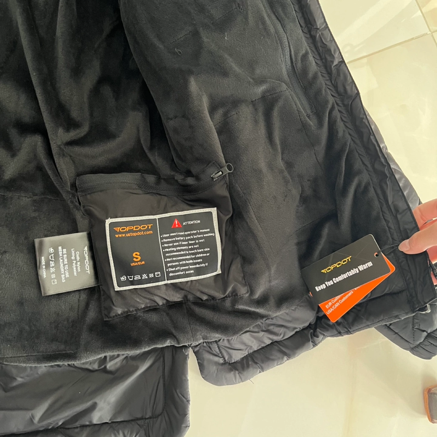 Heats up almost immediately, 10 heating zones, responsive buttons. Includes 16000mAh 7.4V battery pack. Water-resistant and has a soft fleece lining.