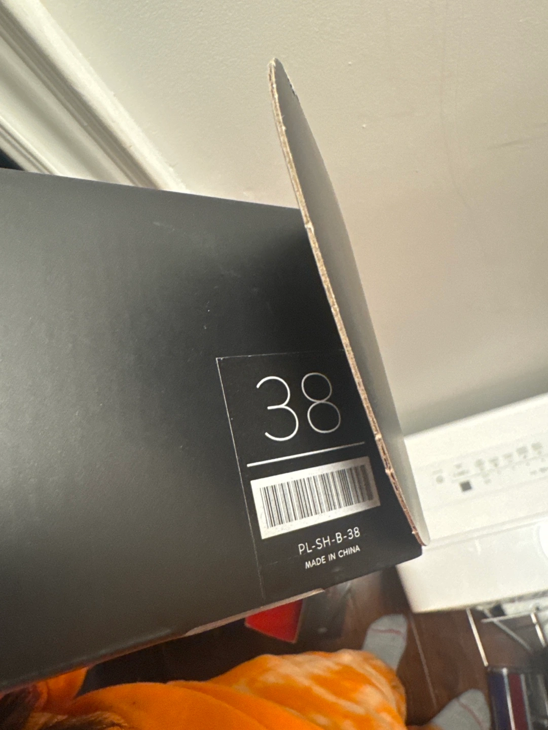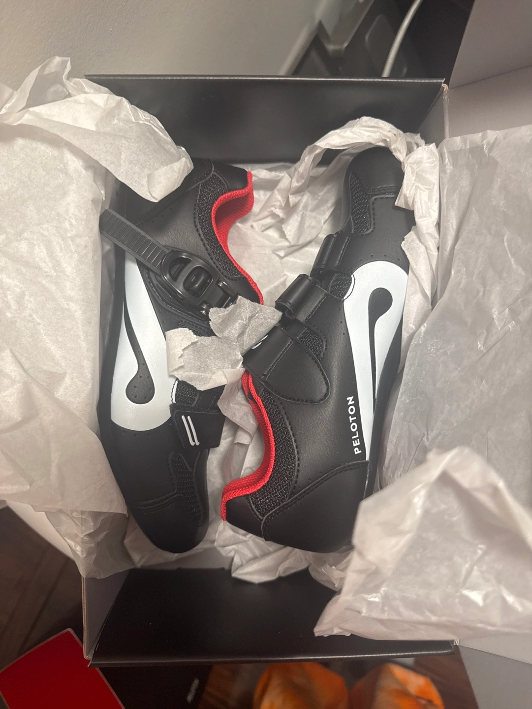 Black cycling shoes with white accents and red detailing. Includes a velcro strap and a clip. Never worn. Size 38. Comes in original box. Never worn. Purchased 2 by accident