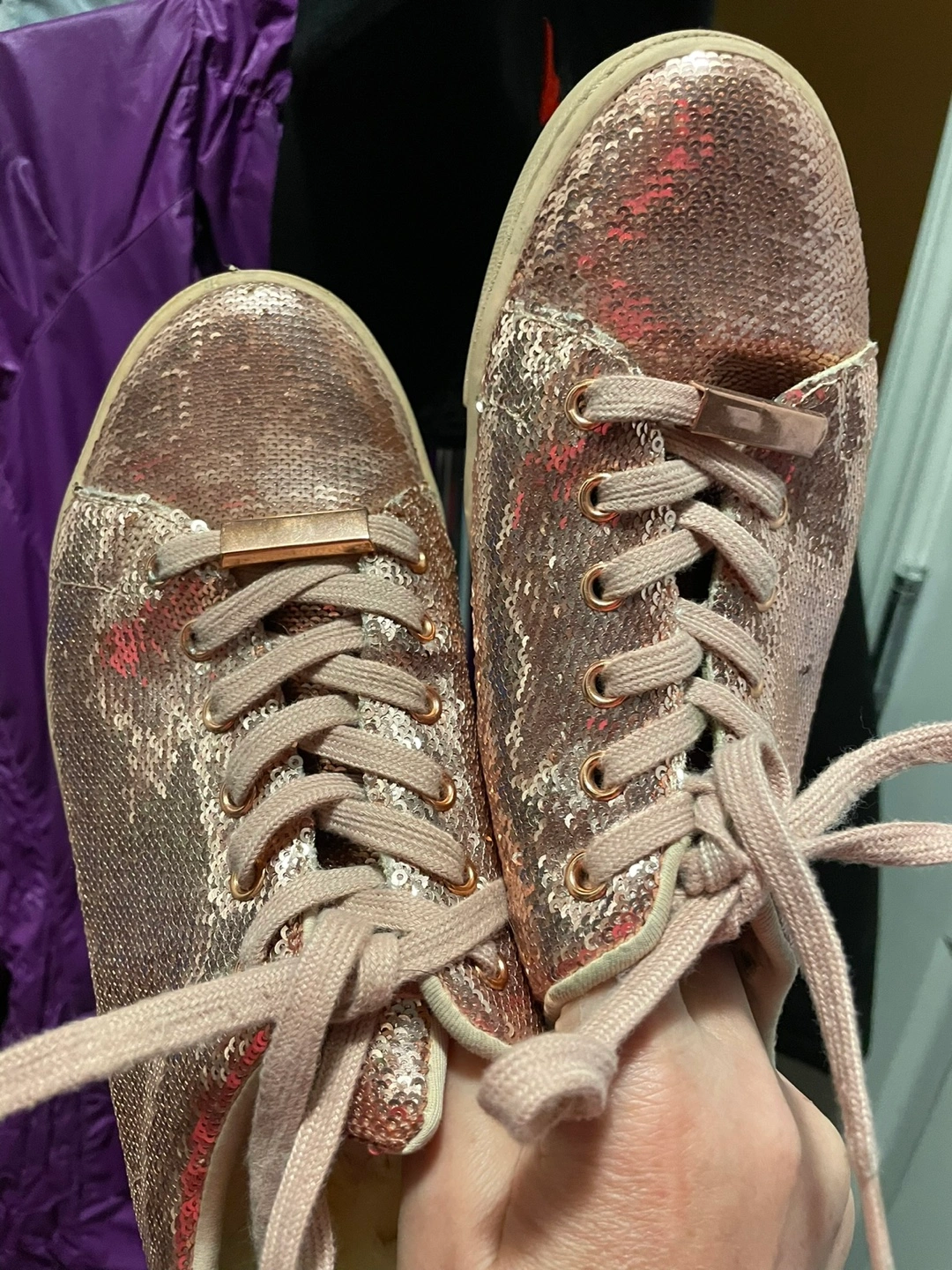 Buy & SellRose Gold Sequined Sneakers🥕Rose Gold Sequined Sneakers🥕$10Rose gold sneakers with sequined upper and white laces. Have a gold accent on each shoe.SizeSize 9.WHERE TO MEETCheck LocationView MapSELLERNatalyNortheast Calgary150 reviews0 chats·0 favorites·21 views