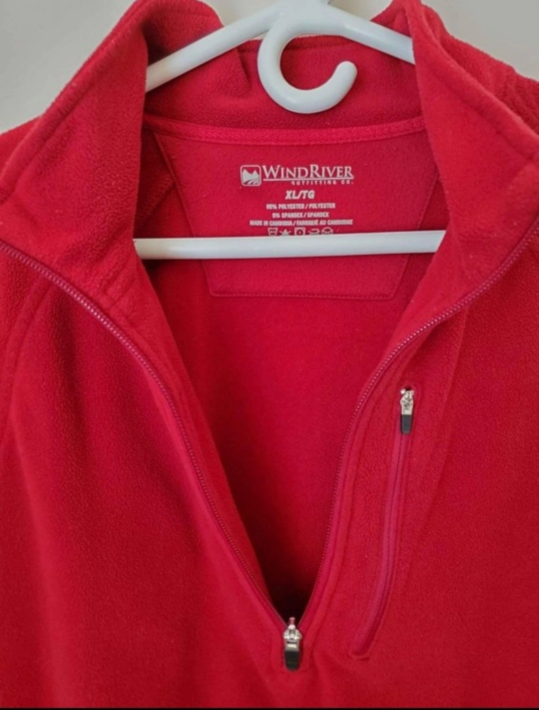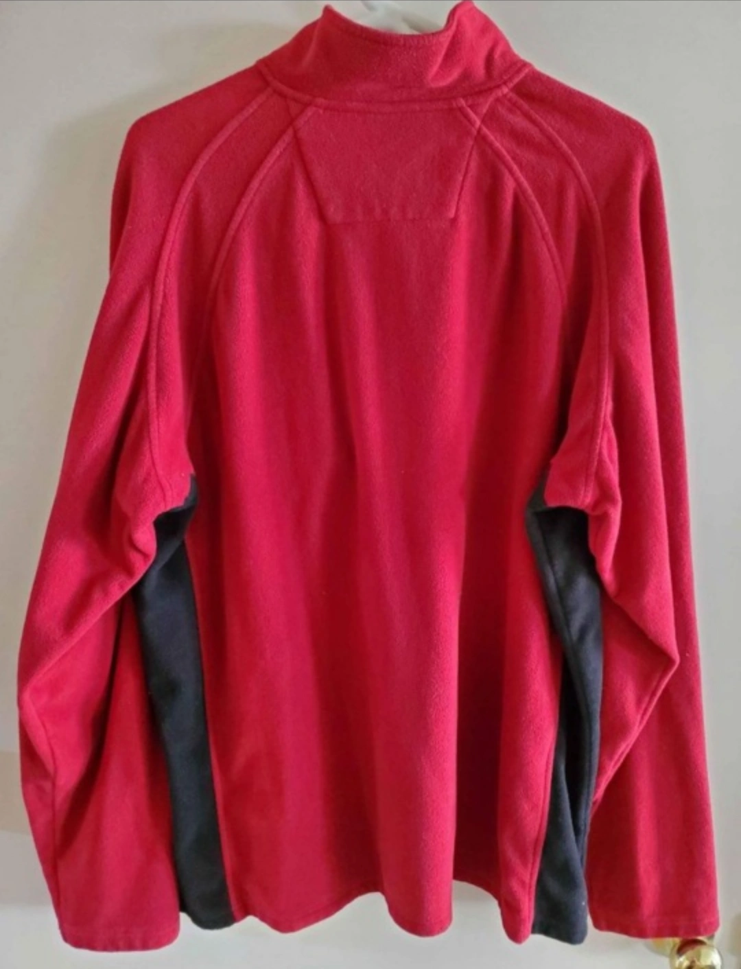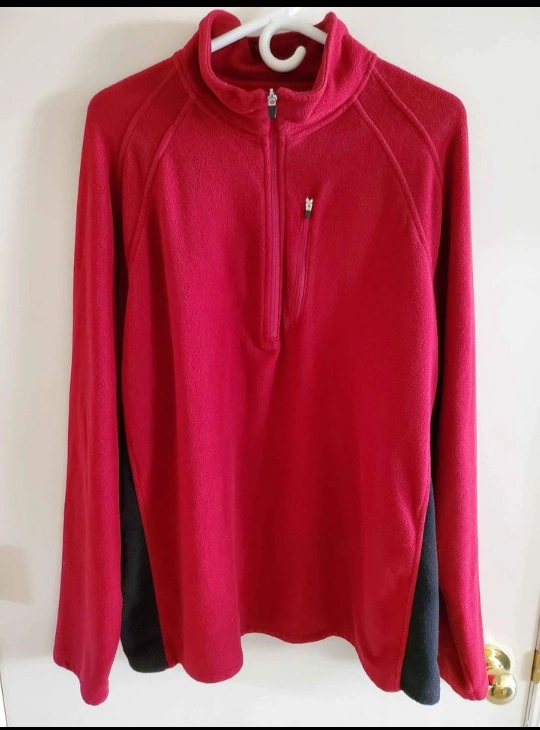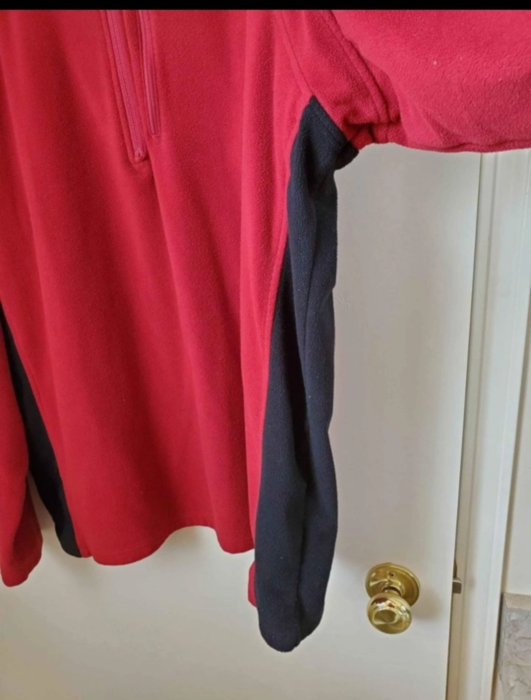 Red fleece pullover with black side panels. It has a chest pocket. Quarter zip. Good condition - no stains or rips.