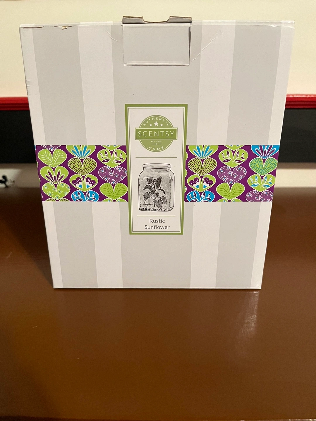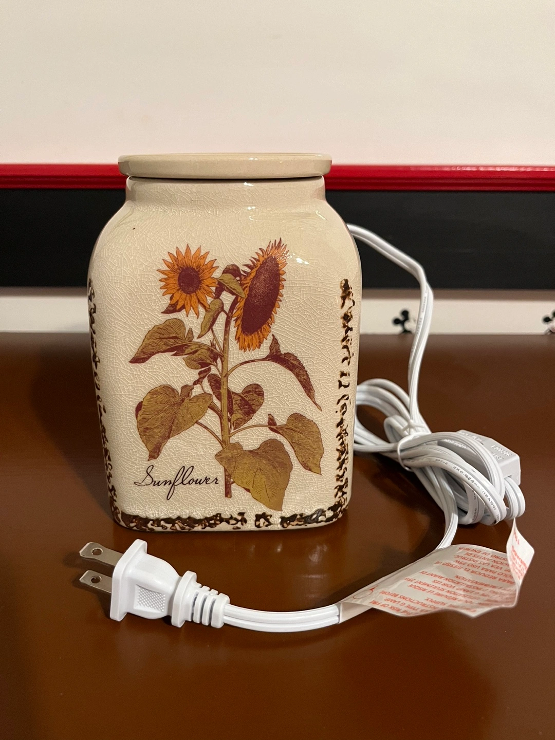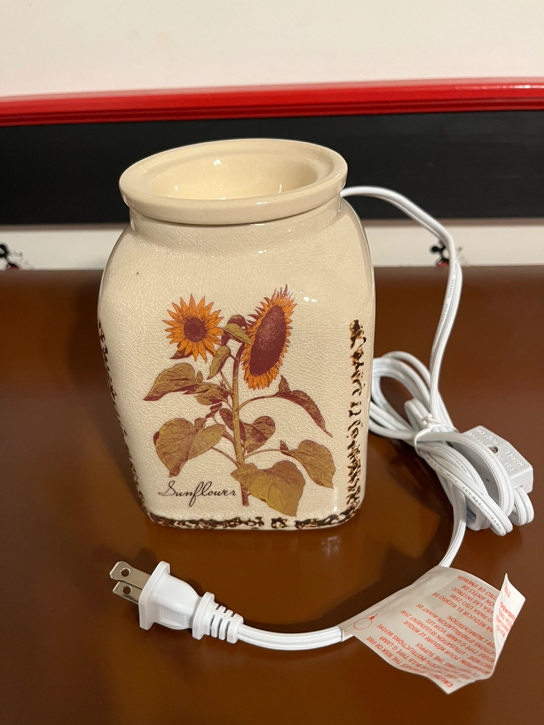 Scentsy warmer with sunflower design. Includes cord, plug and low-watt light bulb (wattage: 25w). Finish is reactive glaze.