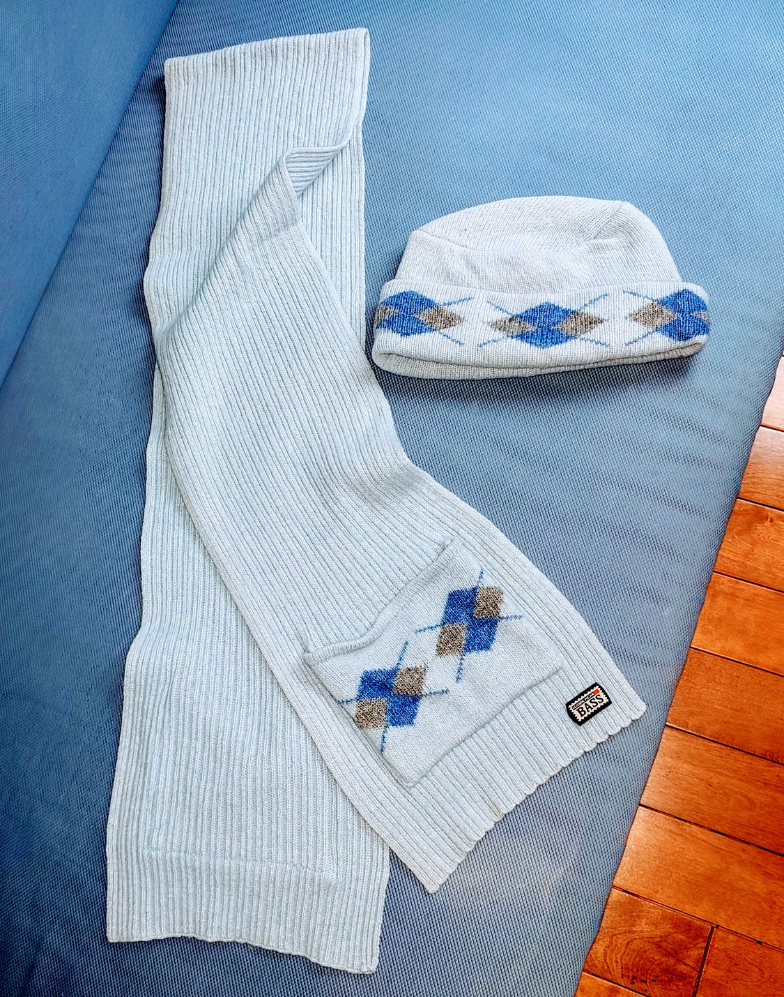 Blue knit hat and matching scarf with diamond pattern. The scarf has 2 pockets. Special bundle deal if getting more items I listed.