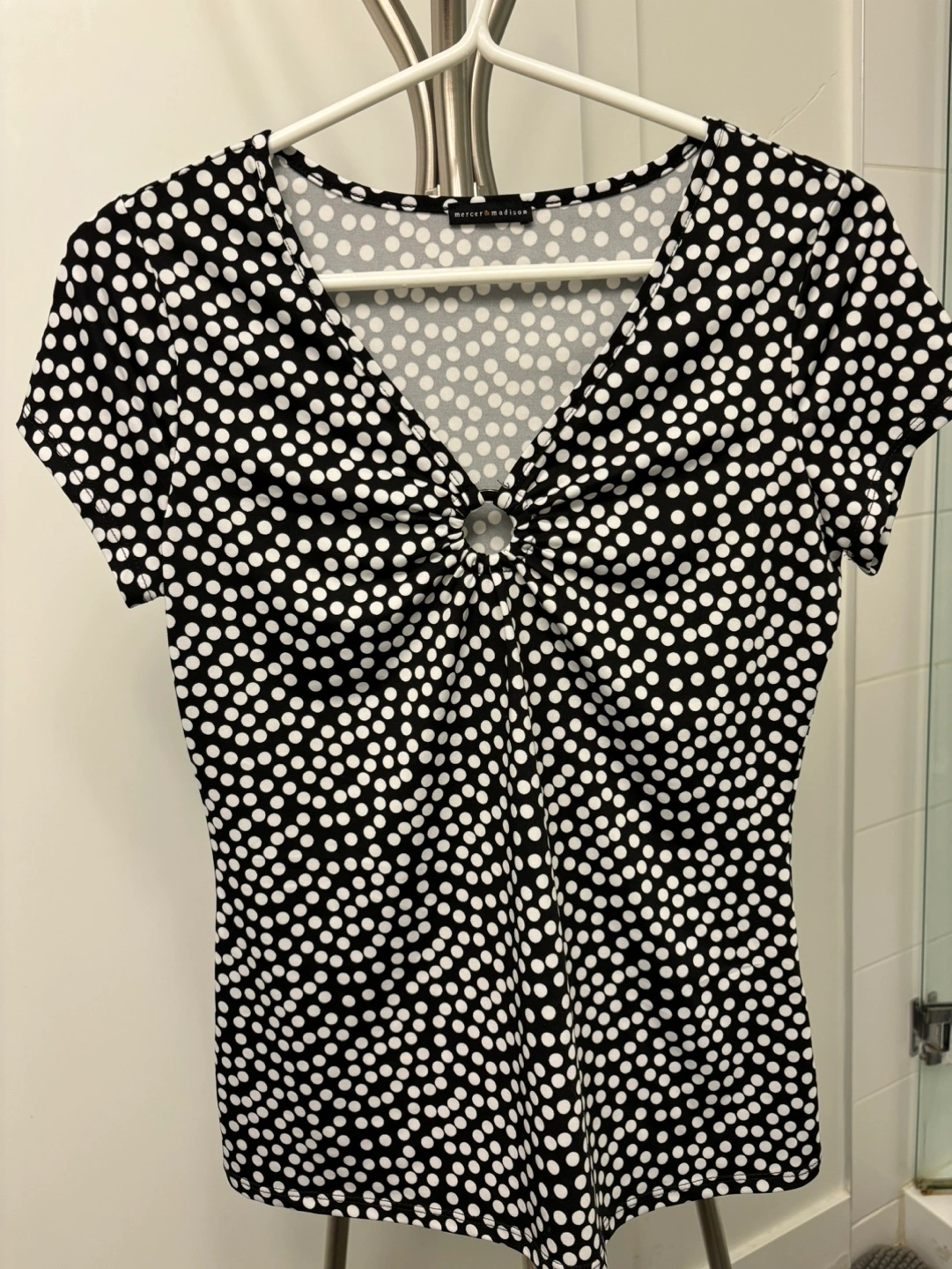 Short-sleeved top with a v-neck and a ring detail at the neckline. Polka dot pattern.