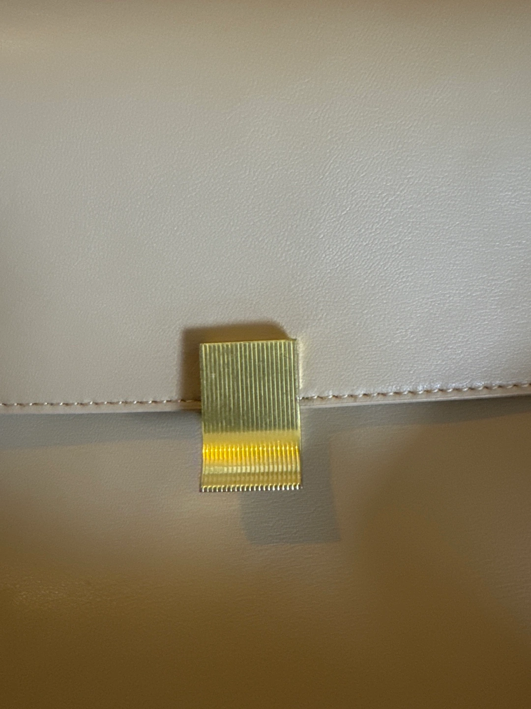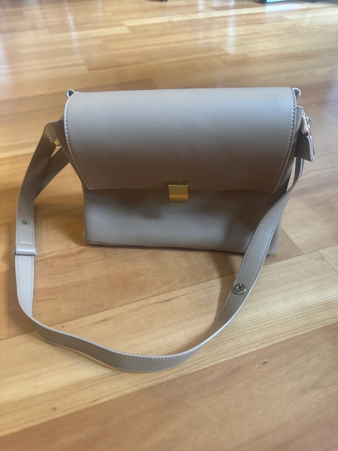 Med beige crossbody bag with a gold clasp and zipper closure. Has one inside pocket. Adjustable strap. Very roomy inside, paid over $150 retail price. Great for office.