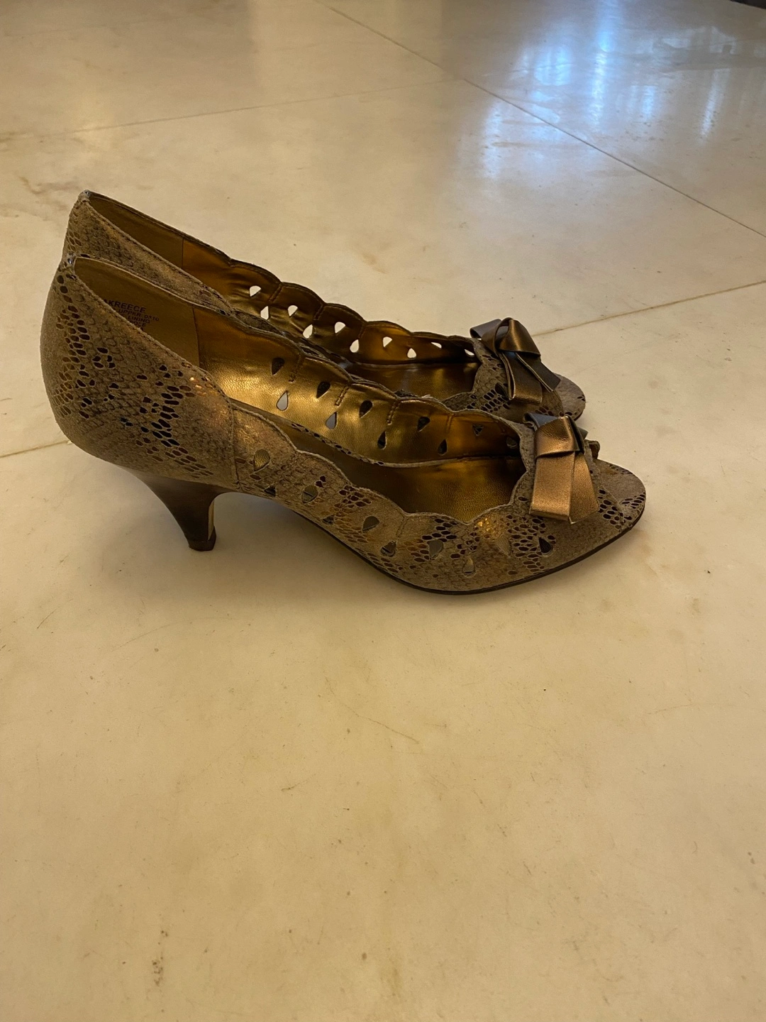 Gold peep toe heels with a bow detail. Size 9M. Cutout design. Pickup Bathurst and Finch area
