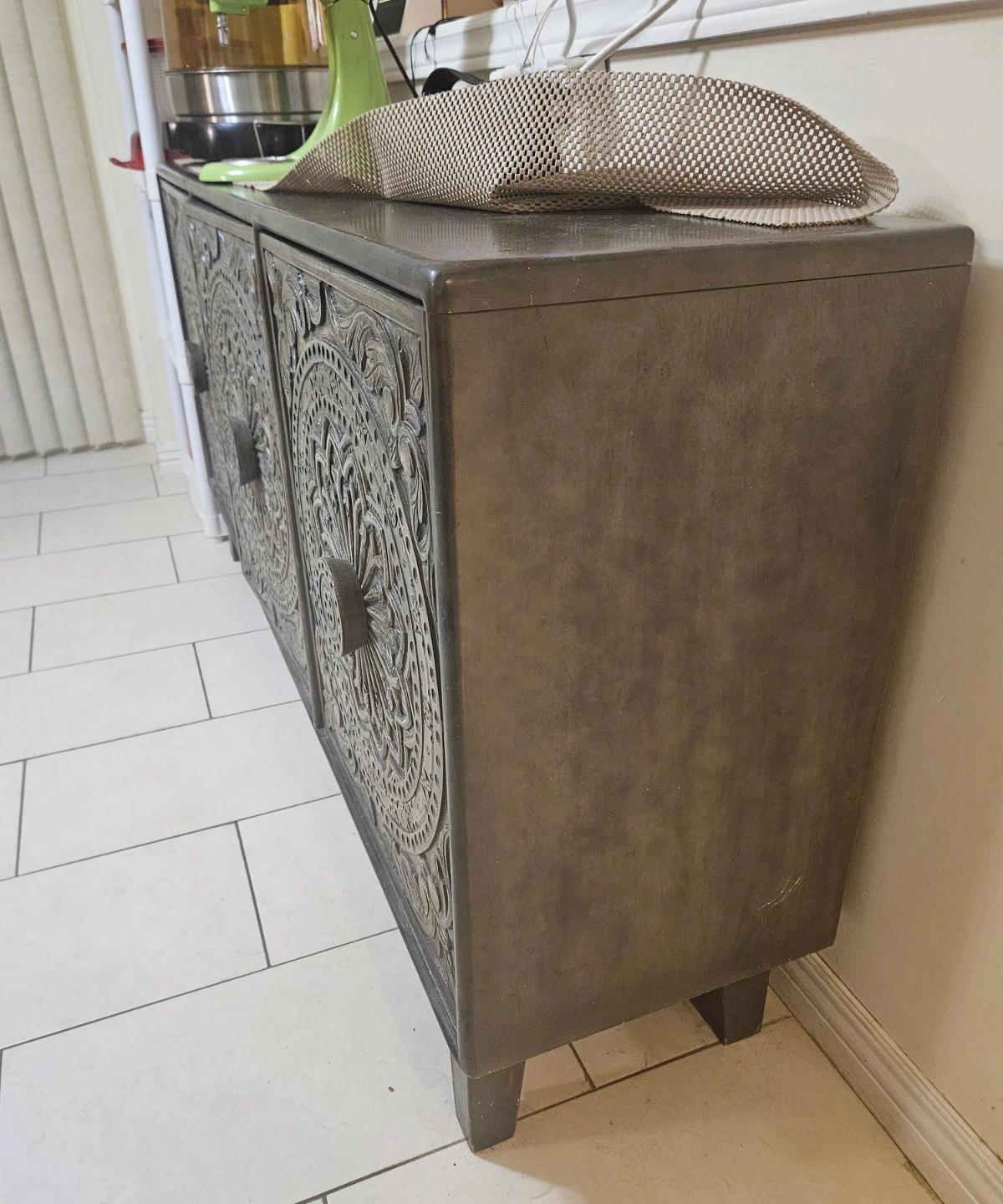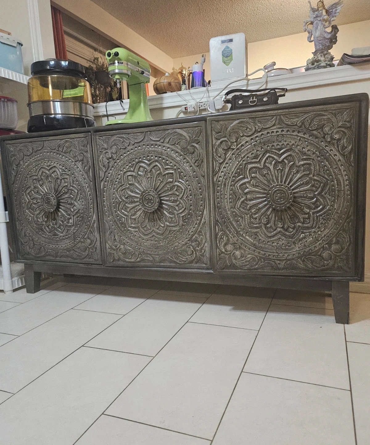 This beautiful sideboard features intricate carved details with a floral medallion design on each door. It's a dark, distressed finish.