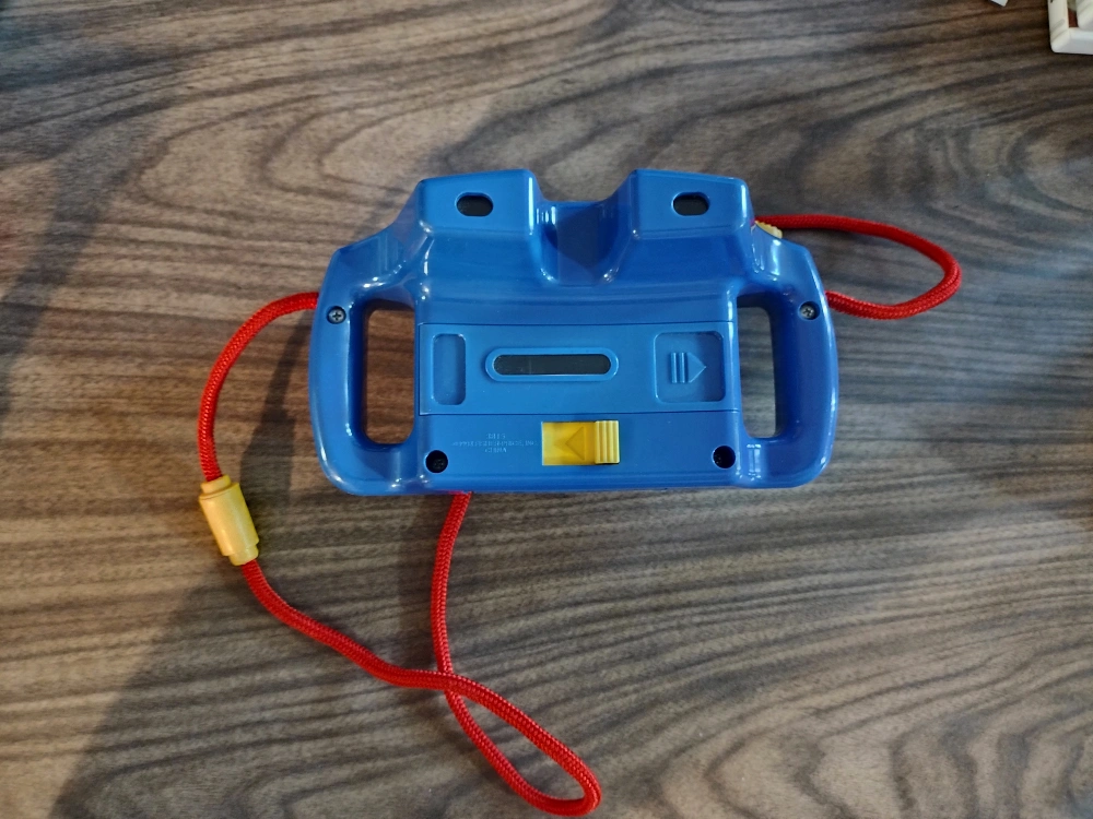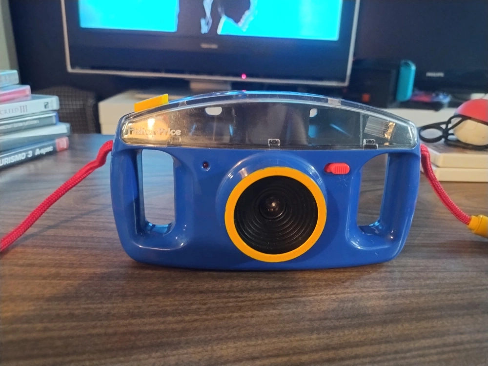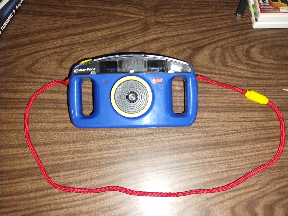 Fisher Price Blue toy camera with a red strap. Works with batteries (batteries not included).
