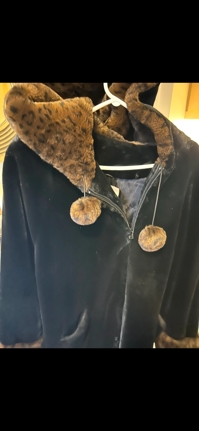 Black faux fur coat with a leopard trim on the hood and cuffs. Has two pom poms on the hood. Size XL/TG.