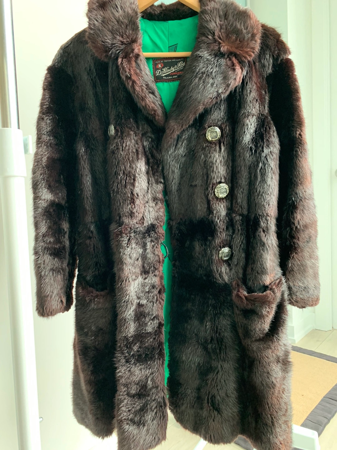 Rich dark brown fur beaver coat. Double breasted with large buttons. Green diamond patterned lining. Front pockets. This coat is for an XS - S covering all the way to the thighs. It is in great condition