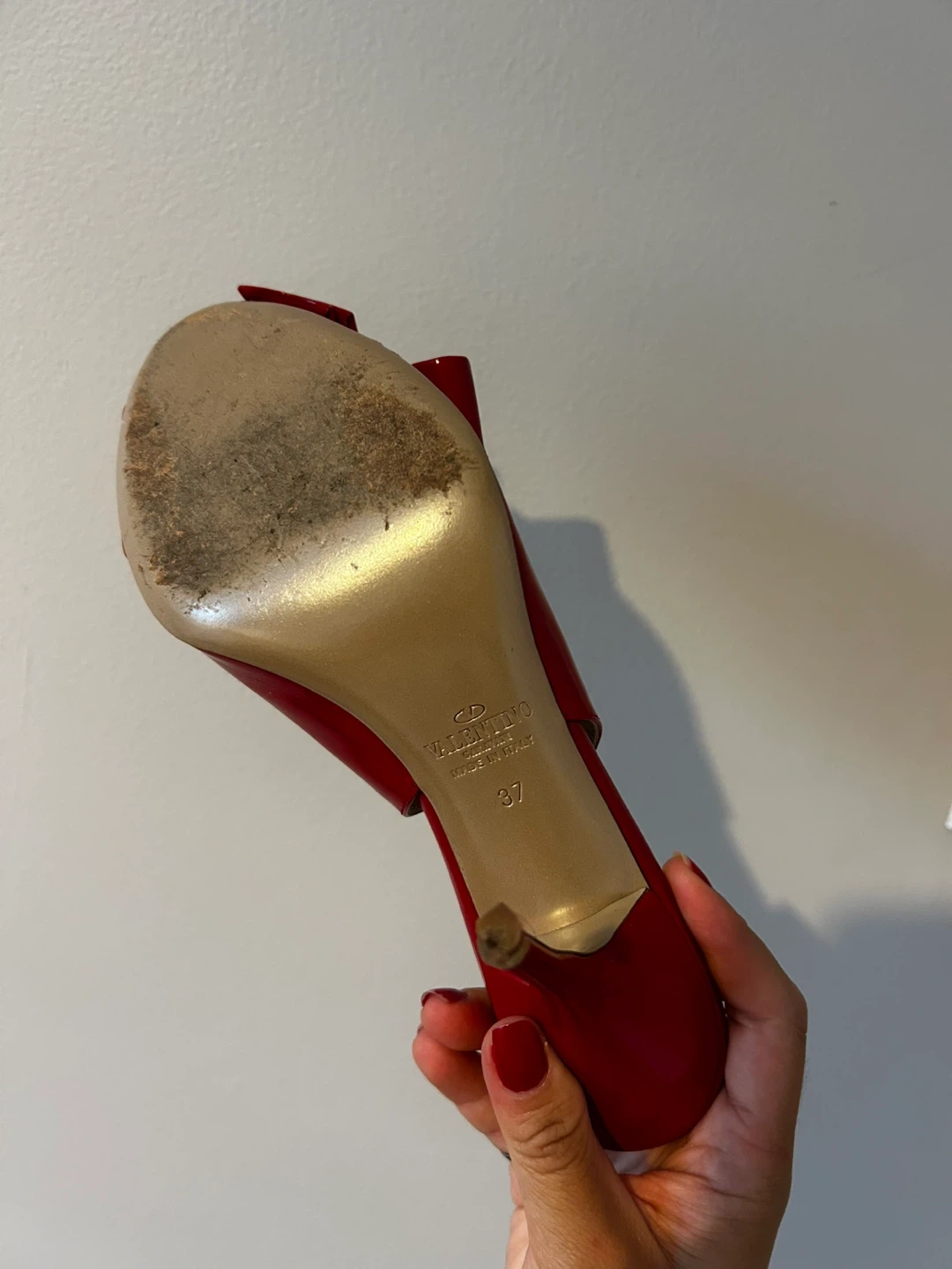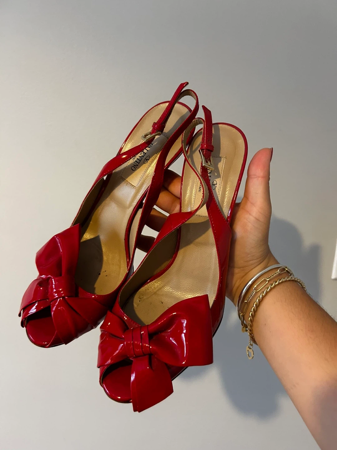 These are a pair of Valentino slingback heels in a vibrant red patent leather. They feature a cute bow detail on the front. Size 37, which is approximately a US size 7. They're in good condition and ready for a new home!