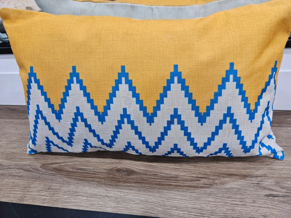 97Decorative pillow with blue and white chevron pattern on a yellow background. 12 x20 inch cover and insert