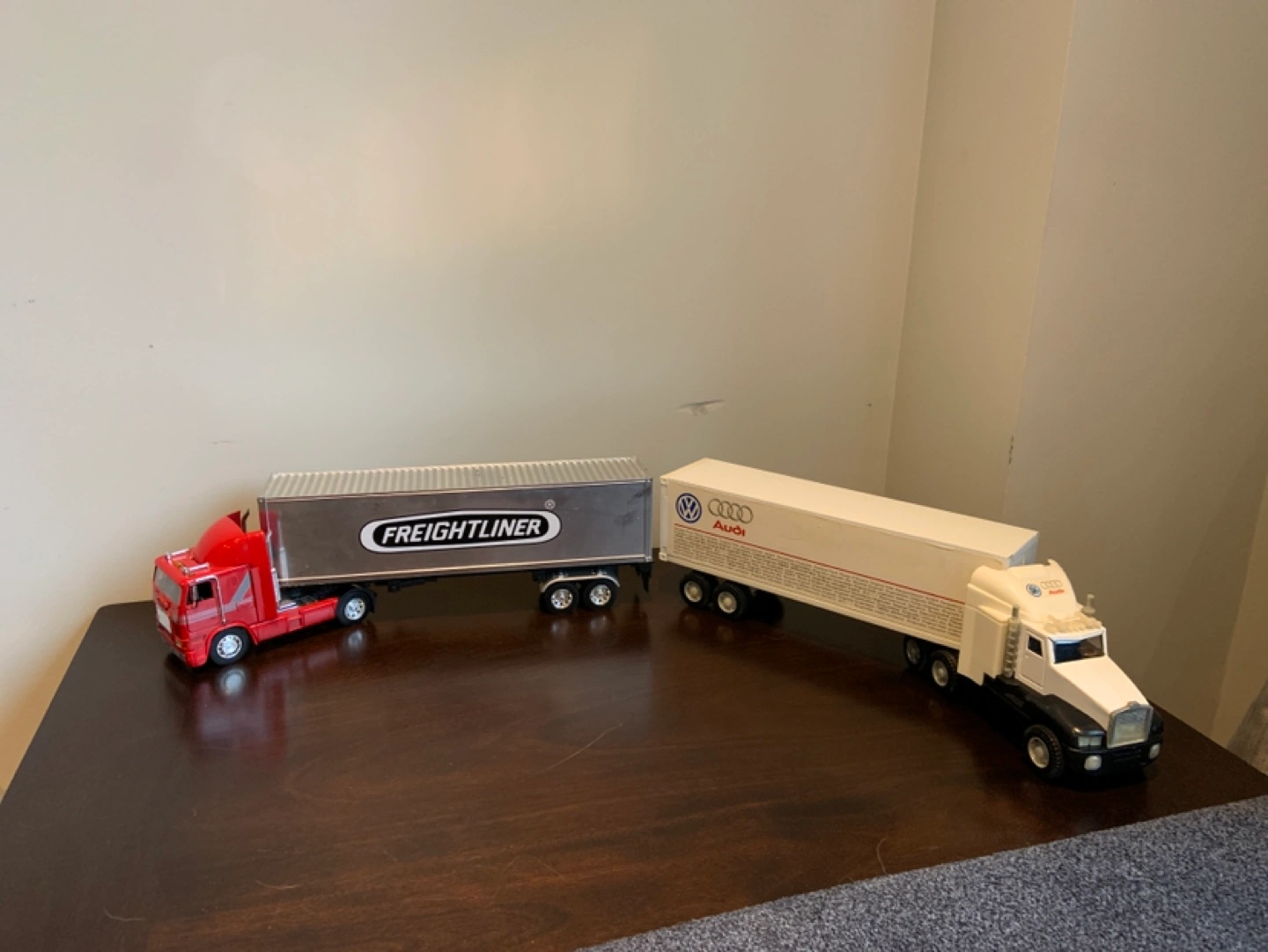 Two toy semi trucks. One is a Freightliner and the other has an Audi logo on it. Both 19 inches in length