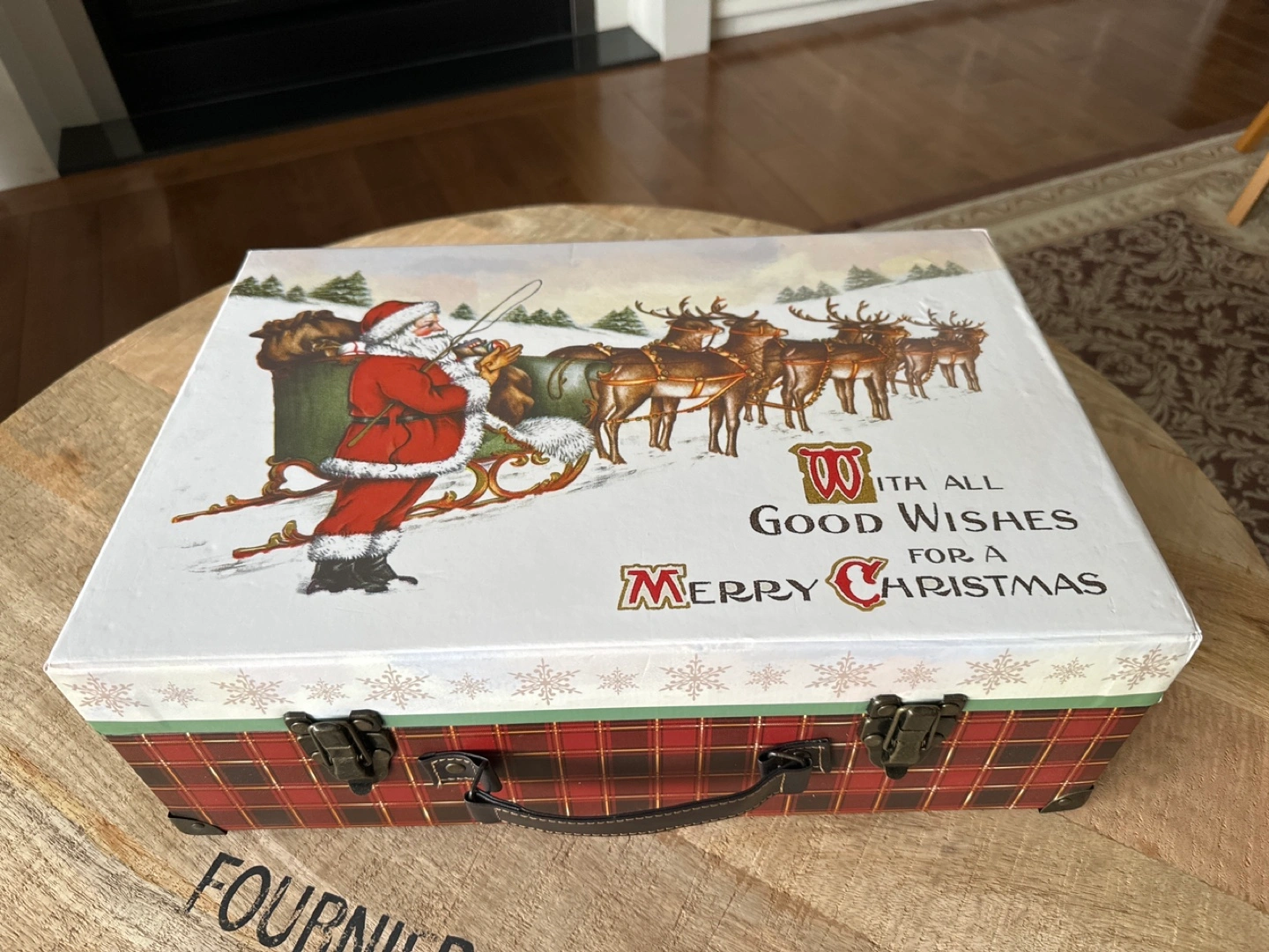 Red and green plaid Christmas box with a Santa Claus design. Features two clasps and a faux leather handle.