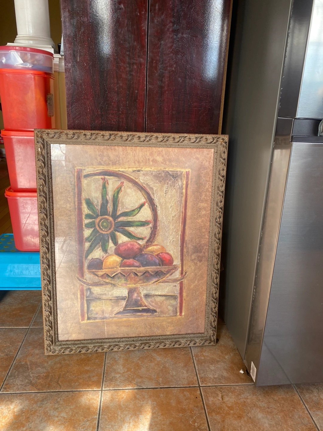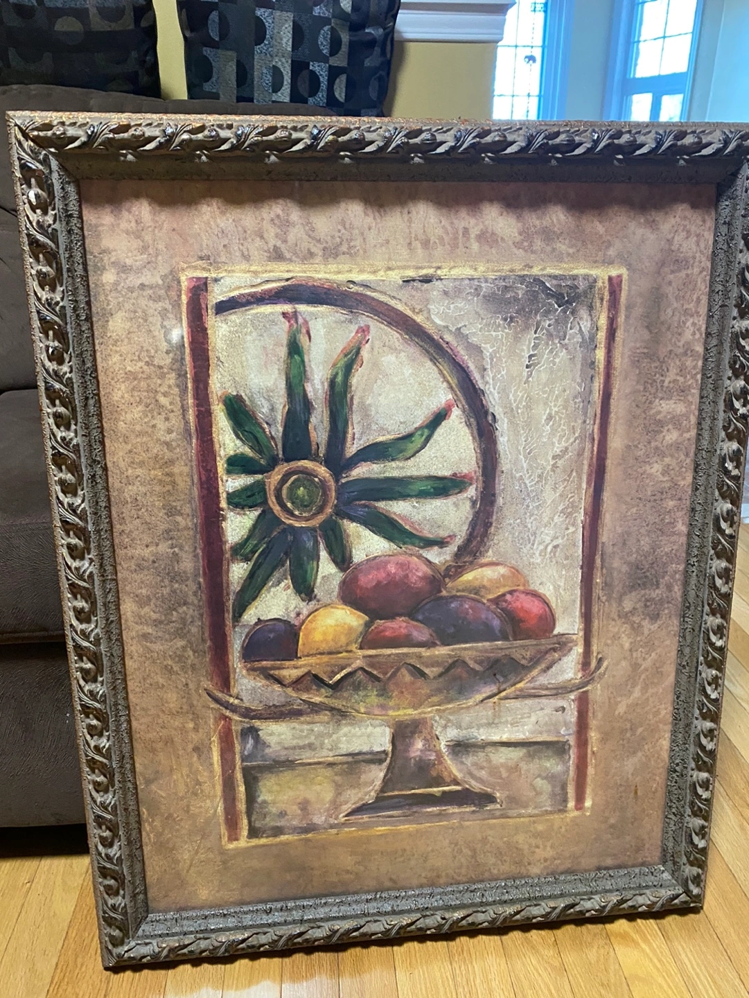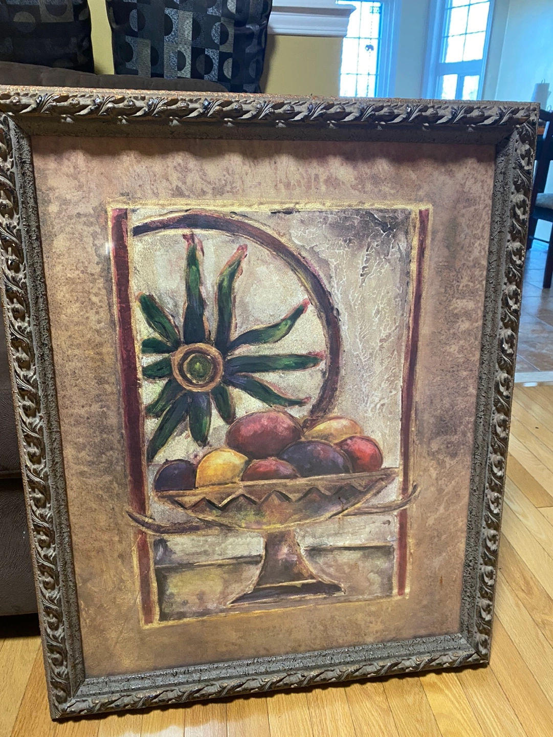 1000+Framed wall art with a fruit and flower motif. It has a gold-toned frame. Heavy